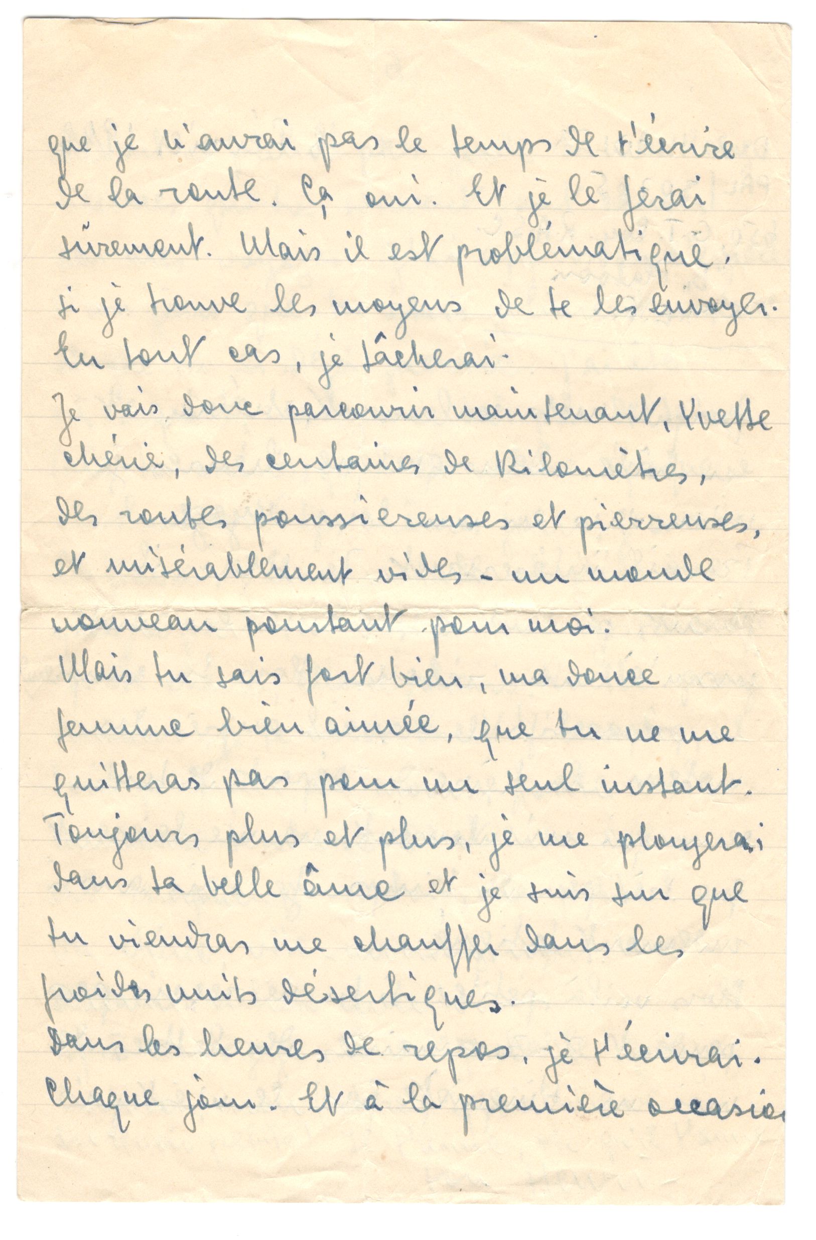 I am now going to cross, dear Yvette, hundreds of kilometres of dusty and rocky roads, roads miserably empty- a new world, however, for me. But you know very well, my sweet much loved wife, that you will not leave me for an instant. Always more and more, I will plunge myself in your beautiful soul and I am sure that you will be there to warm me in the cold desert nights.