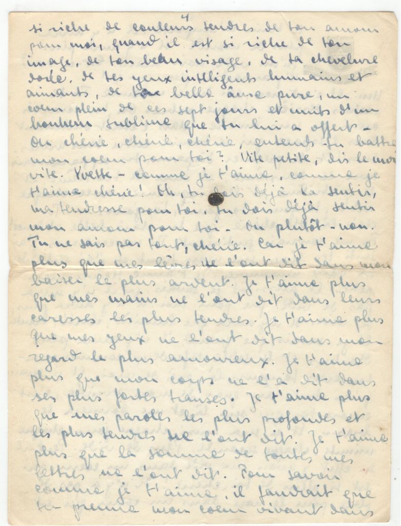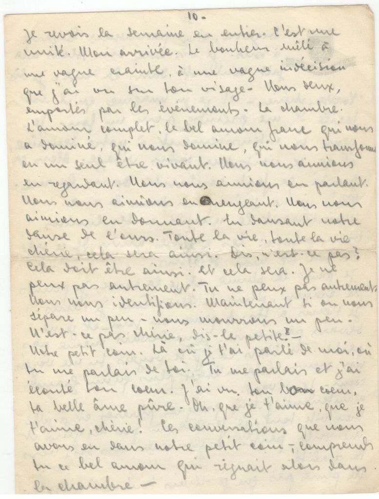 I see the whole week again, in its entirety. It’s a unity. My arrival. Happiness mixed with a vague fear, a vague indecision I saw on your face. The two of us carried away by the events. The bedroom. The complete love, the beautiful love, that we dominated, that dominated us, that transformed us into on single living being. We loved each other in looking. We loved each other in talking. We loved each other in eating. We loved each other in sleeping. In dancing our bear dance. The whole of life, darling, the whole of life will be like that. Won’t it? It should be like that. And it will be. I can’t do anything else. You can’t do anything else. We are identified with each other (Nous nous identifions) now if we are separated a little, we die a little. Isn’t that so, darling, do you agree little one? In the bedroom, have you ever felt on your body arms as tender and as loving as you felt there, that night, when my head reposed on your breast? The sweet wakenings – oh God, God!