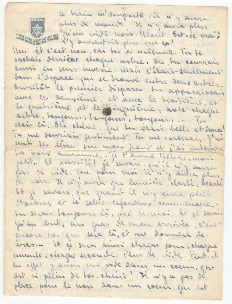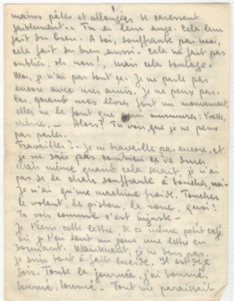 And then after? After I leant my head, empty of all thought, against the dirty wood of the carriage, and through the window I saw, at a very acute angle the whole world go but in reverse. […] You were there. Oh darling, how beautiful you were and sweet! You smiled so gently at me. You kissed me. I felt your lips on my forehead and I heard your voice murmuring “ I love you Henri my little one.” And soon I knew that there would not be any emptiness. That for me there will no longer be blackness. There will only be light, clarity, and beauty […] And just as on the train, here also I see you, my darling, you my sweet and best beloved. I cease you always. I feel you always. I see us in our room; these images don’t want to disappear for a single minute. They are there, concrete, all-powerful and dominate me entirely. Entirely: body and soul. And that makes me feel happy and makes me feel sad. […] Work? I am still not working and I don’t know how long that will last. But even when it happens, I wont have suffering flesh to touch. Me, I have nothing but a cold machine. To touch the steering wheel, the piston, the wheel, what then? Can you see how unjust it is?