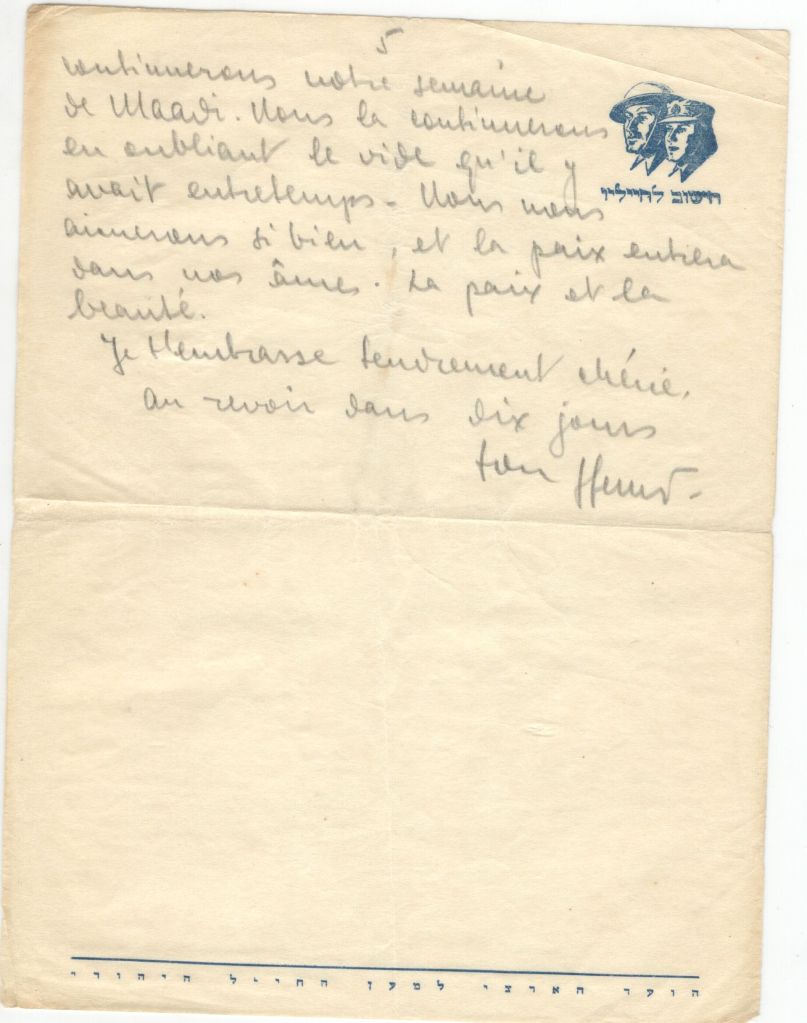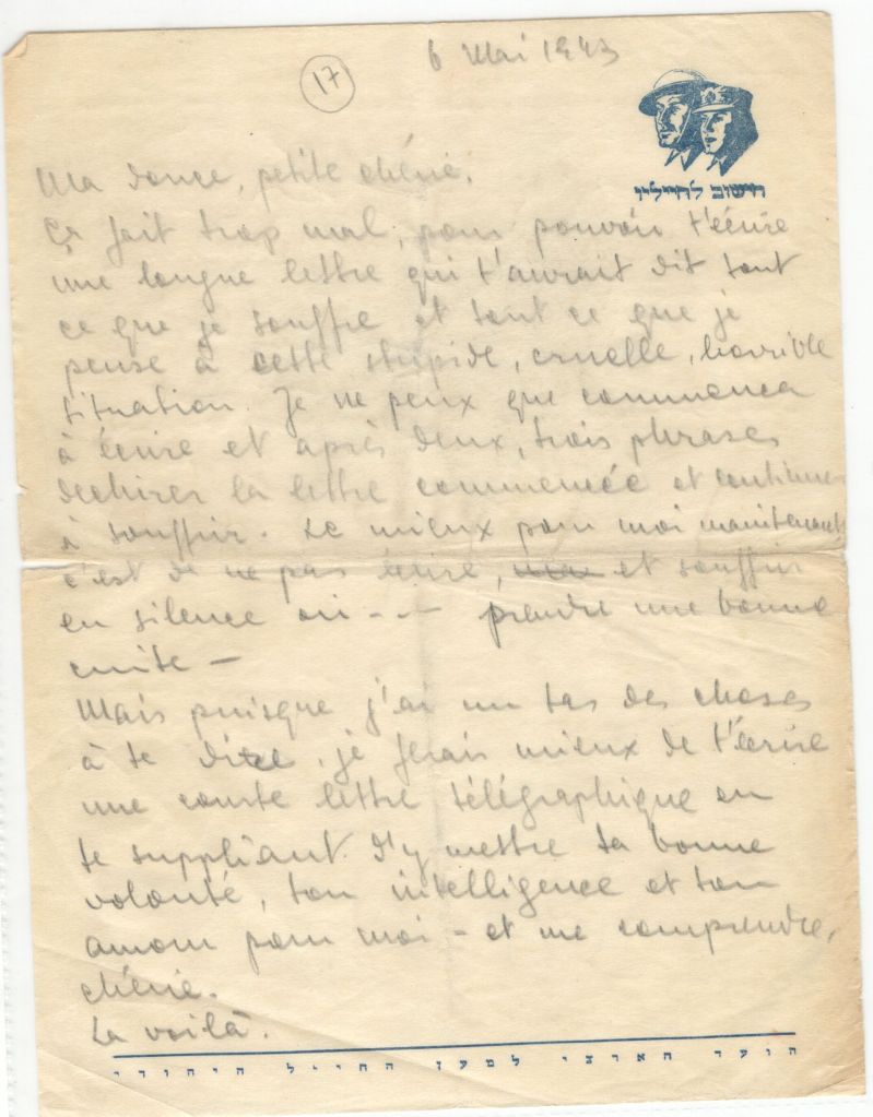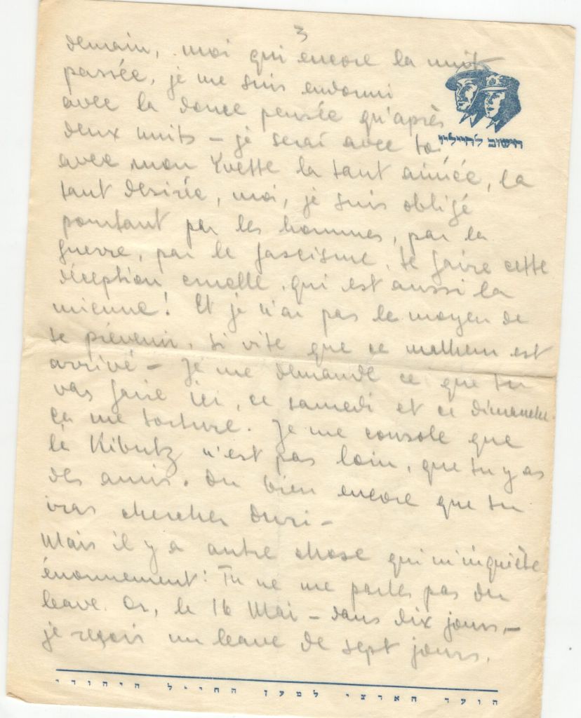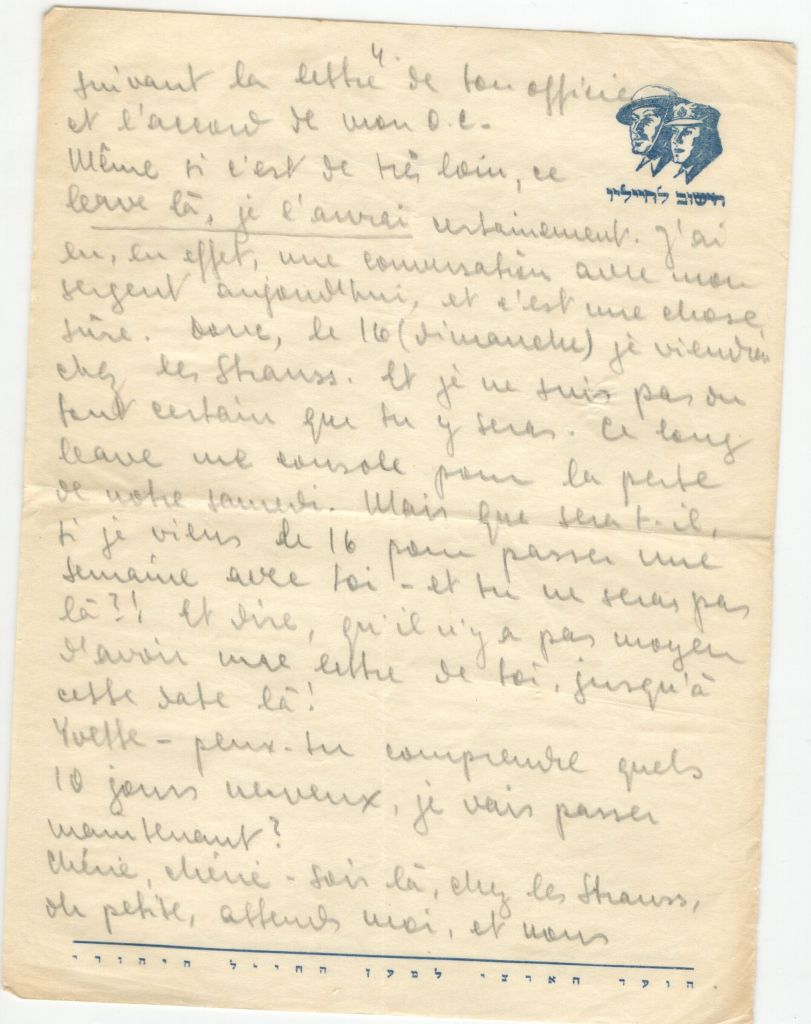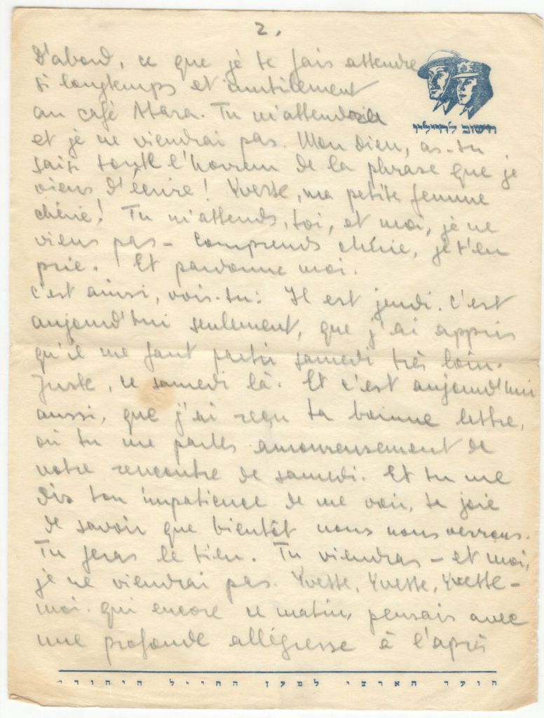 Oh Yvette, so much loved, the so much desired, I am compelled by the men, by the war, by fascism, to deceive you cruelly and deceive myself! And I have not the means to warn you, so quickly has the unhappiness arrived. I ask myself what you will do here, this Saturday and Sunday. That tortures me. I console myself with the fact that the kibbutz is not far, that you have friends there. Or even better, that you will go and find Ouri.