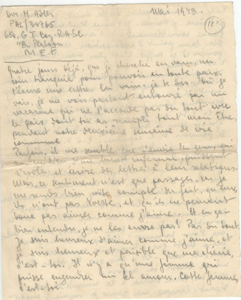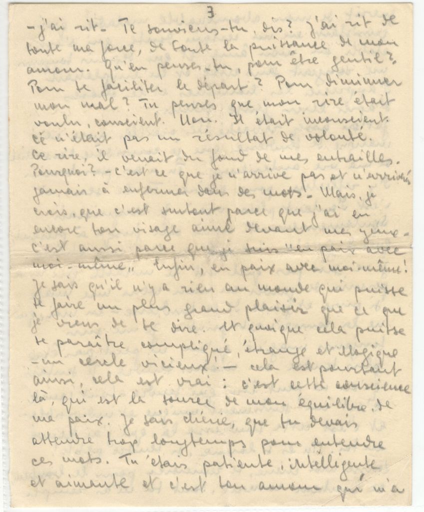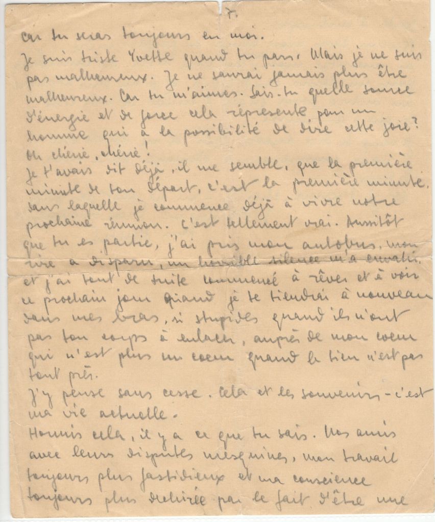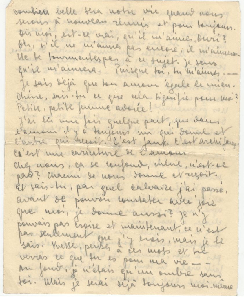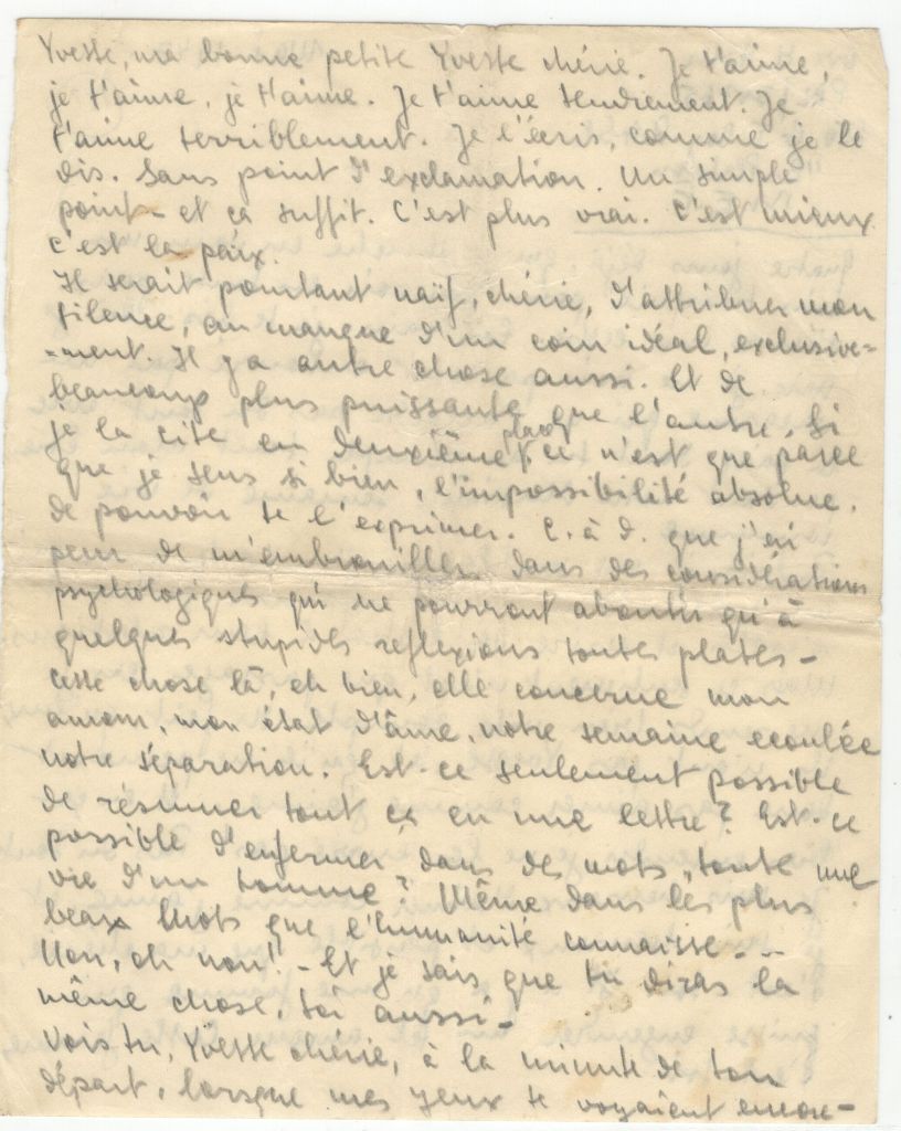 It concerns my love, the state of my soul, our last week together, and our separation. Is it only possible to summarise that in one letter? Is it possible to confine in words a man’s whole life? Even in the most beautiful words that humanity knows… No, oh no! And I know that you will say the same thing yourself also. You see, Yvette, at the moment of your departure, when my eyes still saw you, I laughed- Do you remember? I laughed as loudly as I could, with all the strength of my love. What do you think of that, to be kind? To make the departure easier? To reduce my unhappiness? Do you think that my laugh was willed, conscious? It was unconscious. It was not the result of will. That laugh came from the depth of my entrails. Why? […]– That’s what I can’t manage and never will manage to put into words. But I believe that it is above all because I still have your face before my eyes. It is also because I am “at peace with myself”. At last, at peace with myself! I know that there is nothing in the world that could give me greater pleasure than what I have just said to you. And although that might seem comical, strange and illogical to you- a vicious circle- that is how it is, and it’s true: is it that consciousness which is the source of my equilibrium and my peace. I know darling that you had to wait a long time to hear these words. You were patient, intelligent and loving and it is your love which has cured me of my abominable sickness which consisted of a certain doubt established in my soul and which for a long time preyed on me and prevent4ed me from appreciating men and things at their true worth.