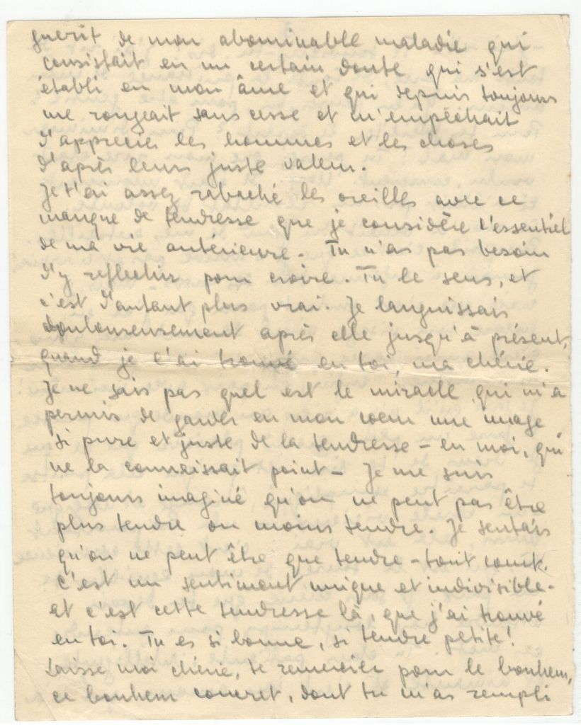 I have already punished your ears with that lack of tenderness that I considered the main thing about my former life. You don’t need to reflect on it to believe it. You feel it and it is even truer. I pined miserably for it right up to now when I found it in you, my darling. I don’t know what miracle allowed me to keep in my heart an image of tenderness so pure and exact – in me who had never known it at all- I had always imagined that I (on) could not be more or less tender. I felt that one could only be tender- that’s all. It is a unique and indivisible sentiment- and it is that tenderness that I have found in you. […]
