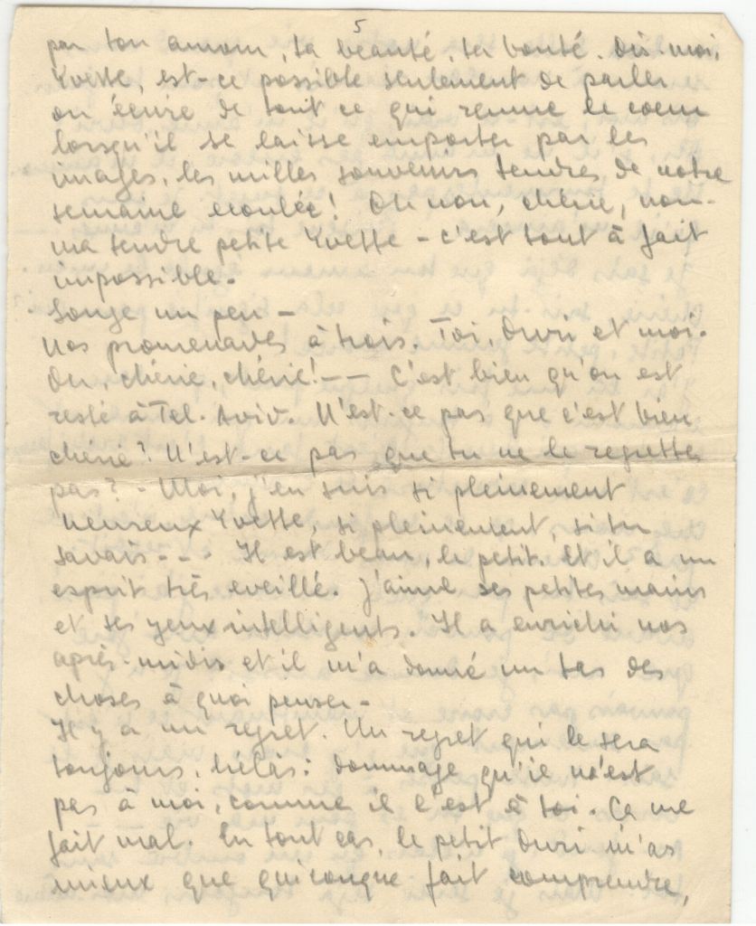 Our walks. The three of us: You, Ouri and me. Oh darling, darling! It’s good that I stayed in Tel Aviv. Isn’t it good darling? You don’t regret it do you? I was so entirely happy, so entirely, if you knew…. He is all right, the little one. And he has a very lively spirit. I love his little hands and his intelligent eyes. He enriched our afternoons and gave me lots of things to think about.