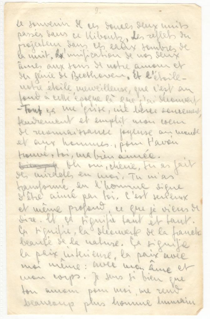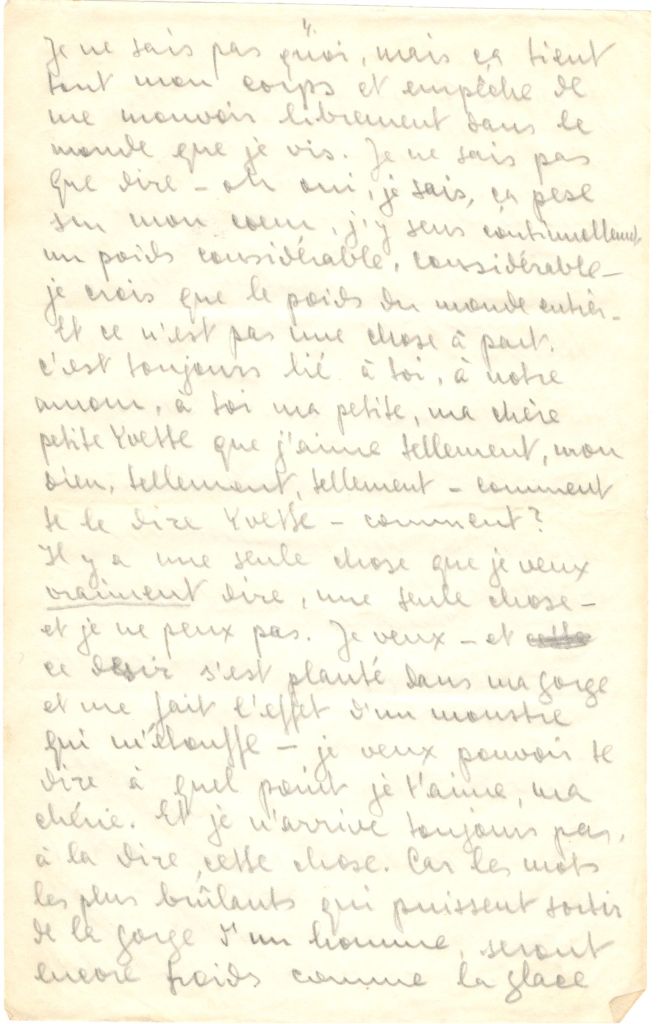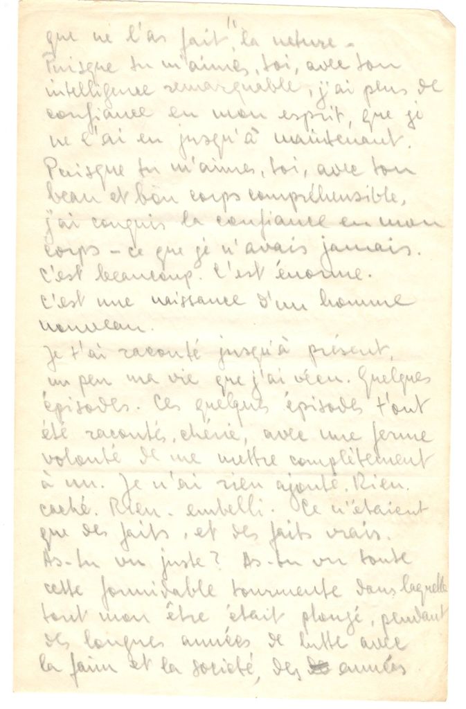 Oh yes, darling, you have wrought miracles in me. You have transformed me into a man worthy of being loved by you. What I have just said to you is serious and even profound. And it means so very much. It means the discovery of the fresh beauty of nature. It means internal peace, with myself: with my soul and my body. I feel so strongly that your love for me turns me into a much more human (humain) man than nature made me. Since you love me, you with your remarkable intelligence, I have more confidence in my mind than I have had up to now. Since you love me, you with your beautiful and good, understandable body, I have gained confidence in my body- something I never had before. That’s a great deal. It’s enormous. It’s the birth of a new man.