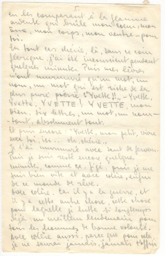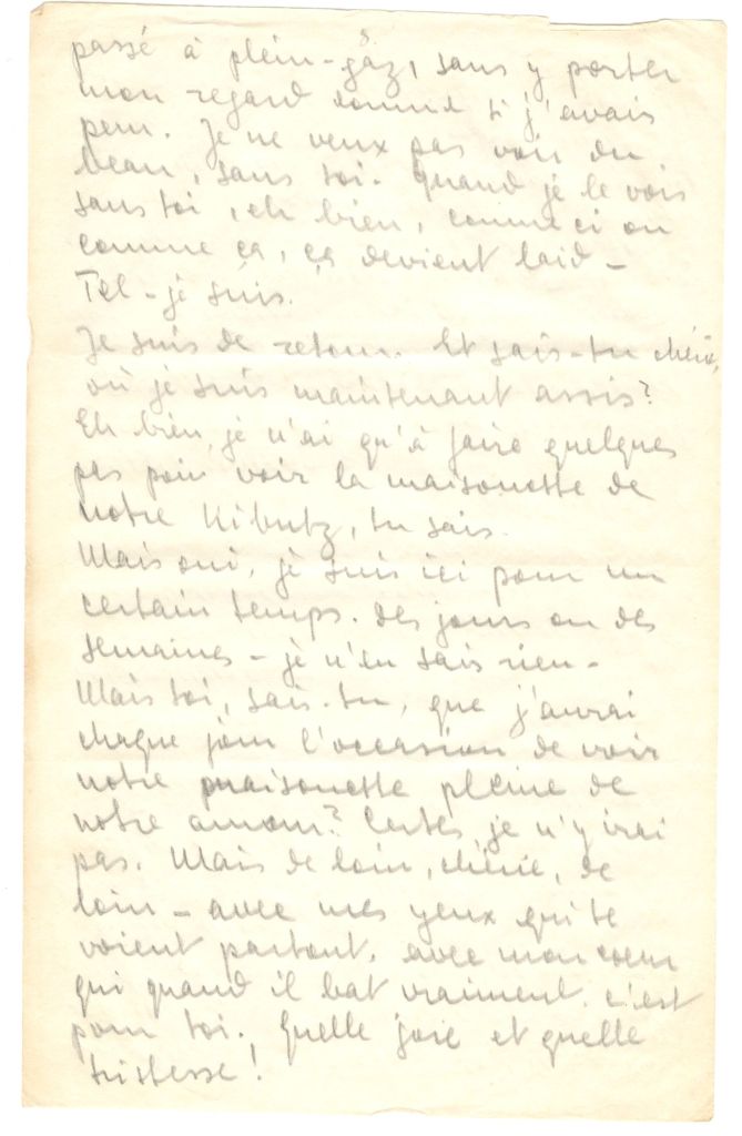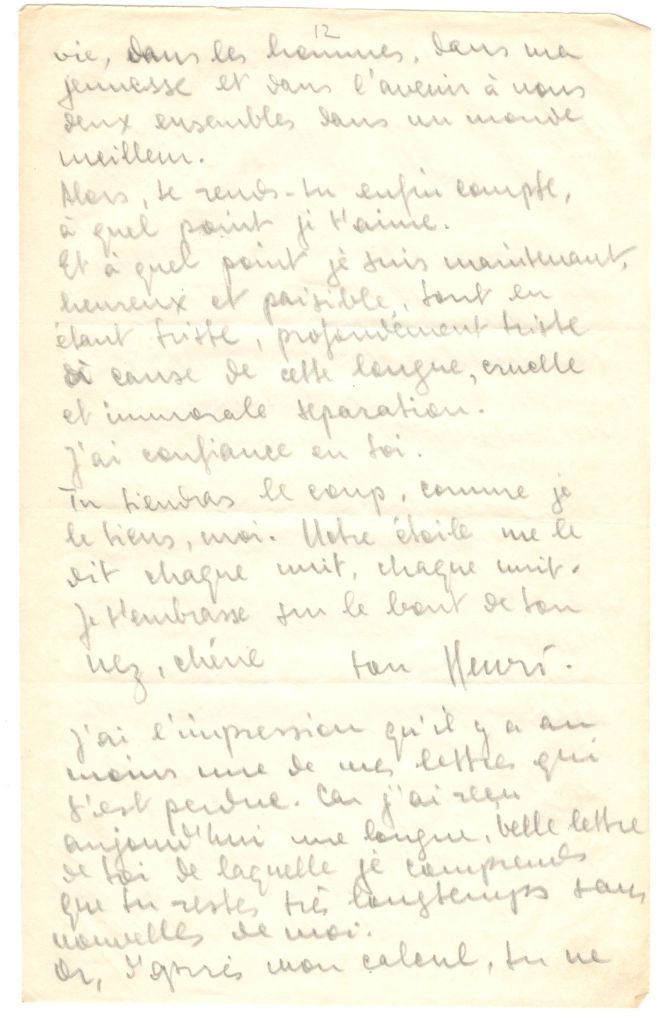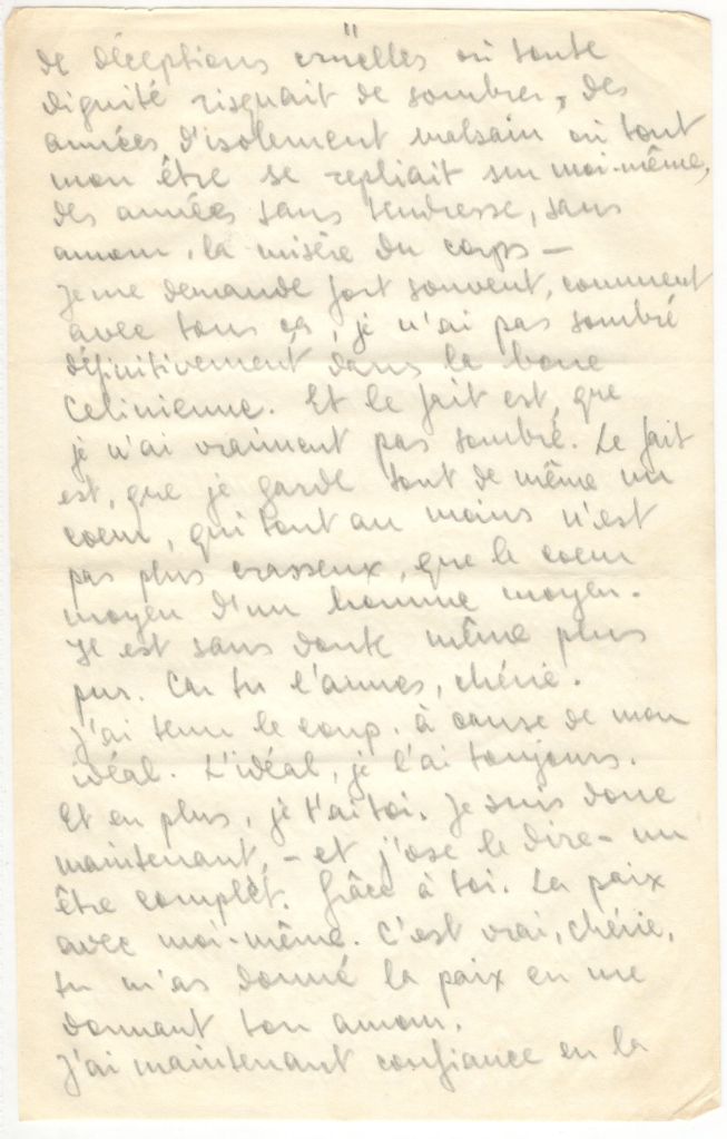 I wonder very often, how with all that, I did not sink finally into the Cellinien mud. For the fact is that I really didn’t sink. The fact is that all along I kept my heart naked, a heart which is no more or less squalid than the heart of your average man. It is actually even more pure. For you love me darling. I have withstood the shock because of my ideal. The ideal that I always have. And even more, I have you. So I am now – and I dare to say it- a complete being. Thanks to you. At peace with myself. It is true, darling; you have given me peace in giving me your love.