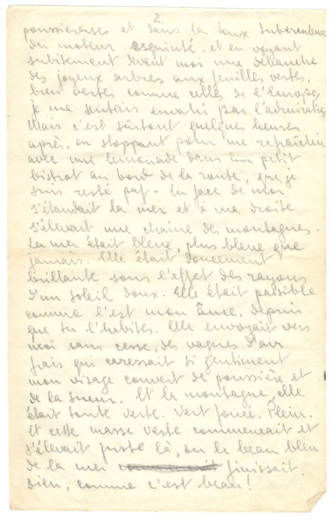 But it was above all several hour later, stopping to refresh myself with a lemonade in a little bistrot on the side of the road, that I was bowled over – in front of me stretched the sea and to the right rose a chain of mountains. The sea was blue, bluer than ever. It was shining sweetly under the rays of a gentle sun. It was as peaceful as my soul is since you inhabited it. It sent towards me without cease, waves of fresh air that gently stroked my dusty and sweaty face. And the mountain was all green. Dark green. Full. And that green mass began and rose just there, where the beautiful blue of the sea finished. God how beautiful it is!