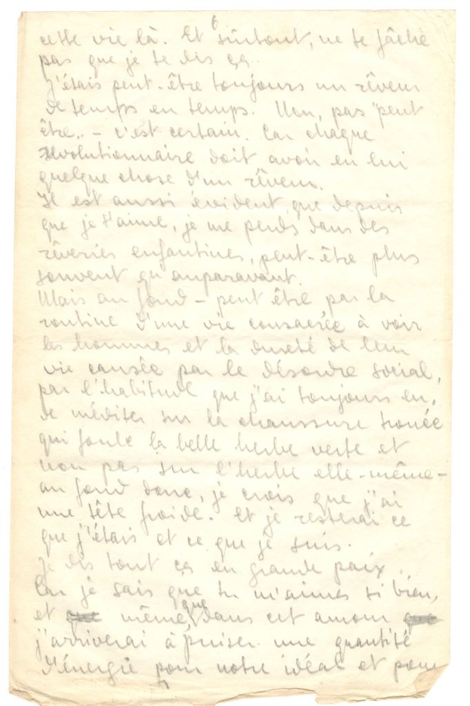 But deep down- perhaps because of the routine of a life consecrated to looking at men and the harshness of their lives caused by social disorder, because of my habit of always contemplating the broken shoe that tramples the grass and not the beautiful green grass itself – deep down, then, I believe that I have a cold head. And I will remain what I was and what I am. I say all that in great peace. For I know that you love me so well, and that from this love I will succeed in drawing a lot of energy for our ideal and for