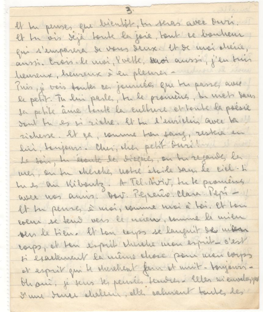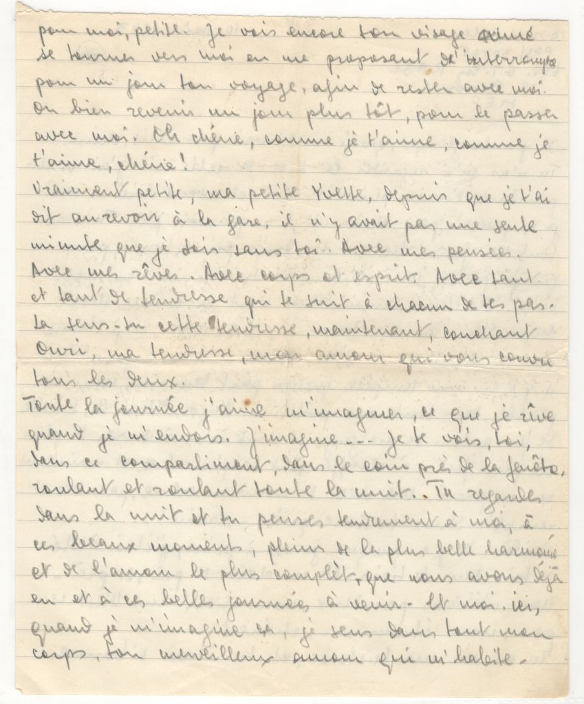 During the day I love to imagine what I dream when I am asleep. I imagine—- I see you in that compartment, in the corner near the window, rolling and rolling through the night. You are looking out into the night and thinking tenderly of me, of the beautiful moments, filled with the most beautiful harmony and the most complete love that we have just spent and of the beautiful days to come. And I, here, when I imagine that, I feel throughout my whole body your marvellous love which inhabits me. And you think that soon you will be with Ouri. And you already see all the joy, all the happiness that will possess both of you. And me also, darling. Believe me, Yvette. That makes me happy, happy enough to cry.