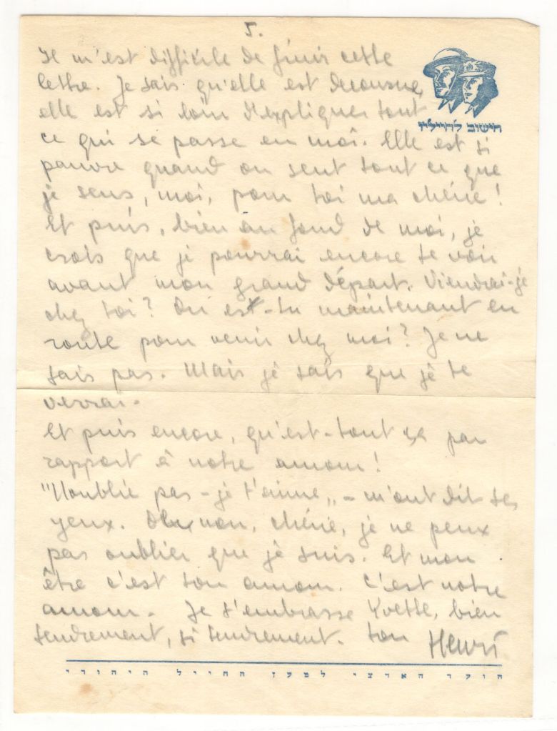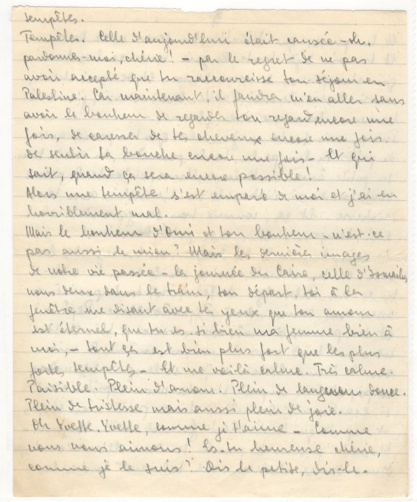 In the evening, you listen to records or you look at the sea or you look for our star in the sky – if you are at the kibbutz. At Tel Aviv, you stroll with our friends. Dov. Pejneno. Clara. Pepi – And you think of me, as I of you. And you heart reaches out to mine, as mine to yours. And your body pines for my body and your spirit seeks my spirit- it is so exactly the same thing for my body and spirit which seek you day and night- always- Oh yes, I feel your tender thoughts. They envelop me with sweet warmth; they calm all the storms. Today’s was caused – oh forgive me, my darling! – by regret at not having accepted that you shorten your stay in Palestine. Because now, I must go along without having the happiness of looking into your eyes once more, of caressing your hair once more of feeling your mouth once more. And who knows then that will be possible again!