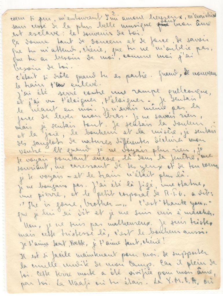 It was so funny when you left. When, once again, the train carried you off. I was pressed against some sort of rise (rampe) and I saw you get further and further away. I felt the emptiness in me. I didn’t even have the strength to lift my arm. I knew nothing but I felt everything. I felt pain and joy, happiness and misery. I felt the sobs of different natures tightening my belly. And when I could see you no more, I could still see you, there in the window, smiling at me, caressing me with your eyes and with your heart, I saw you – even when the train was no longer there.