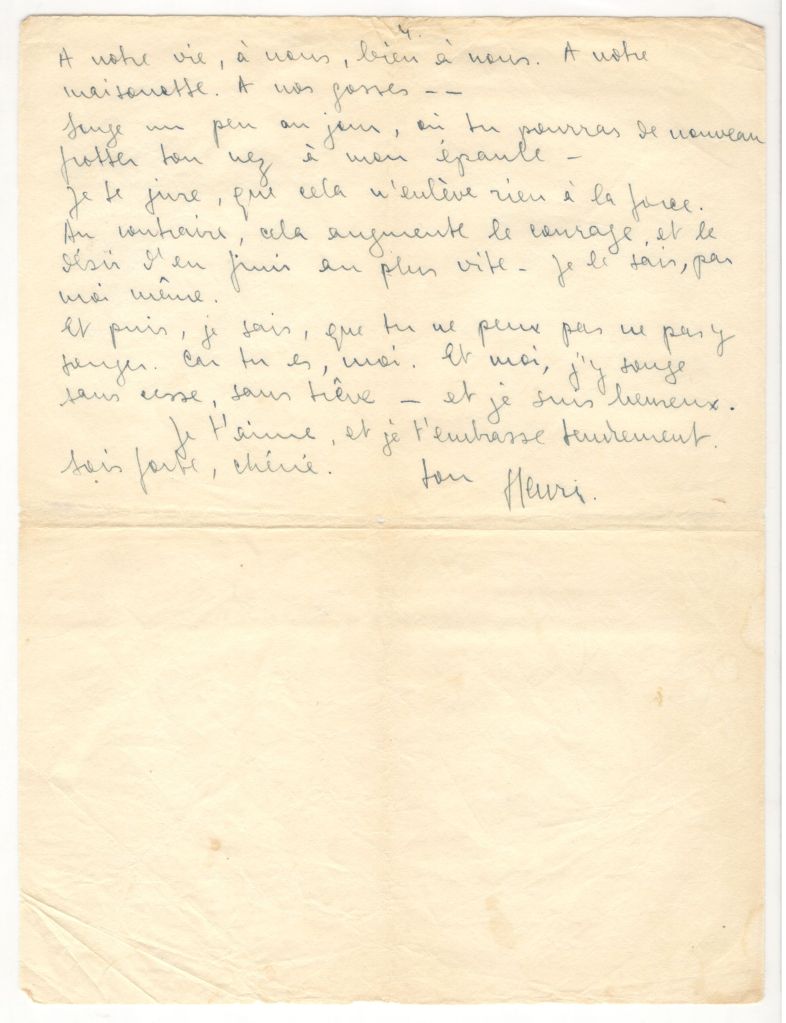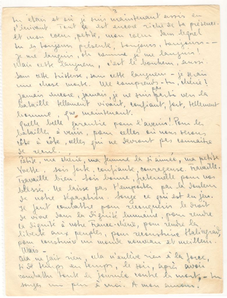 Little one, my darling, my wife so loved, my little Yvette, be strong, confidant and courageous. Work. Work hard. Be good, brotherly towards our wounded. Do not let yourself be carried away by the pain of our separation. Consider what is at stake. We must fight to reconquer the right to live with human dignity, to give dignity back to our France, darling, to give back liberty to the peoples, to rebuild Stalingrad, to build a new and better world.