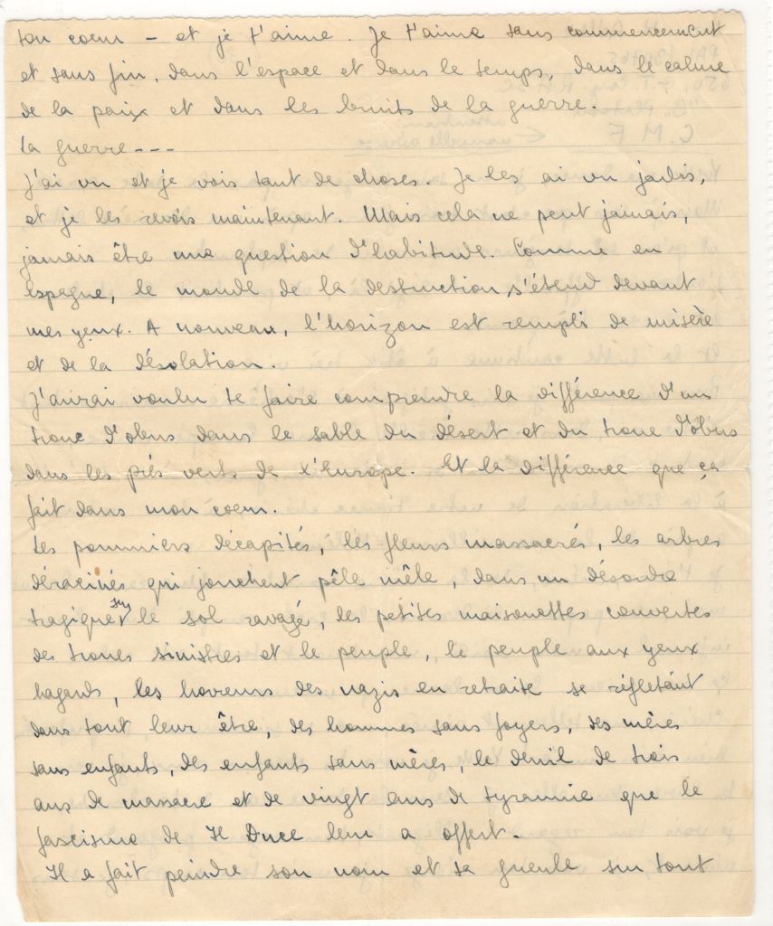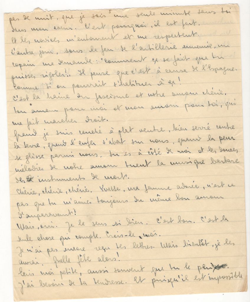 I love you darling. You are always near to me. In my most difficult moments, it is you who comes towards me and caresses me, consoles me and gives me courage. There is no day, there is no night when my heart is without you for a single minute. That’s why it is so strong. And the novices surround me and respect me. The other day, under enemy artillery fire, a pal asked me “How is it that you can joke!” He thinks it is because of Spain. As if one could become accustomed to that!