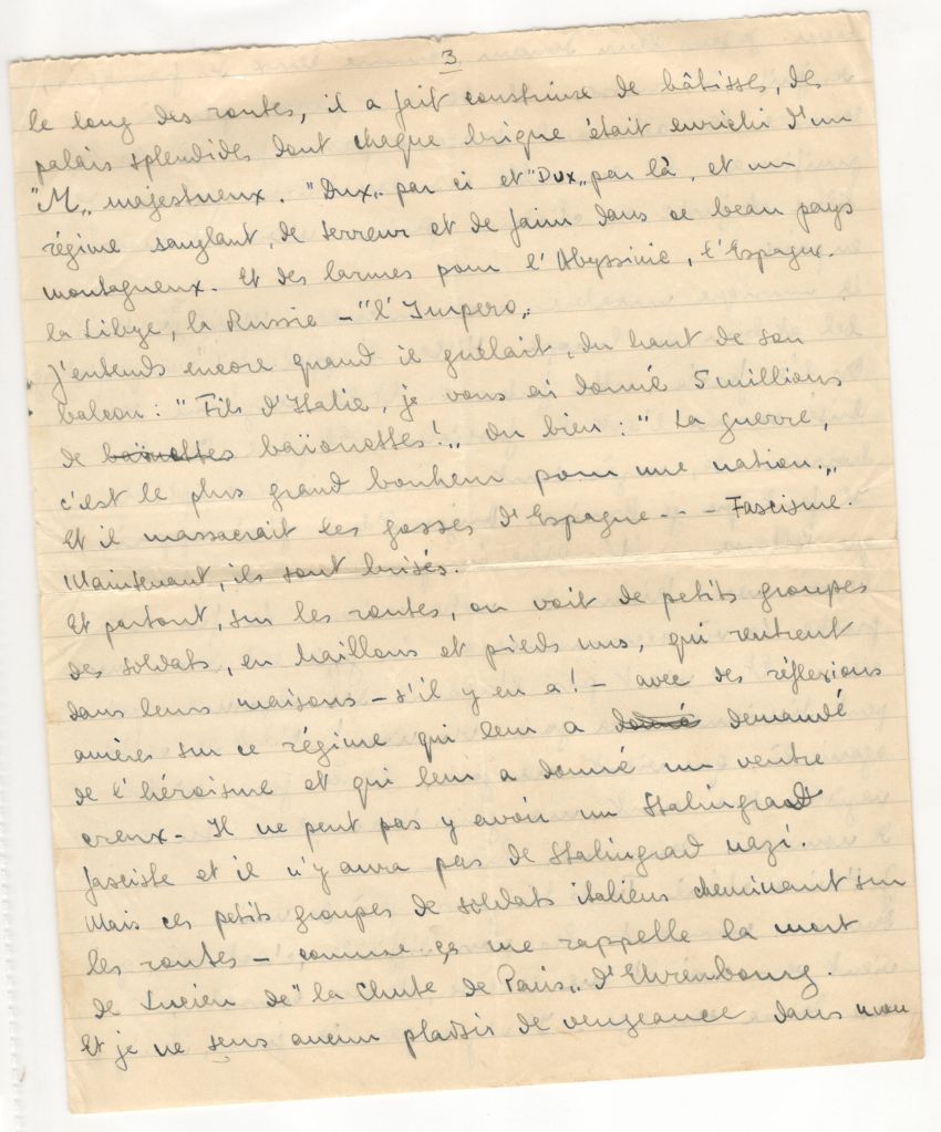 Especially on the roads, I see little groups of soldiers, in rags and bare feet, who return to their houses – if they still exist! – with bitter reflections on the regime which demanded heroism and which gave them a hollow belly. They could not have a fascist Stalingrad and there will not be a nazi Stalingrad. But these little groups of Italian soldiers walking along the roads – how that recalls to me the death of Lucien in “the Fall of Paris” by Ehrenburg. And I feel not a bit of vengeful pleasure in my heart. I feel their pain, like that of the French, the Jews and the Russians. They must go that way, as the Germans must go that way. That will purify them. And together, one will build a free and just world in which every one can live and die in peace.