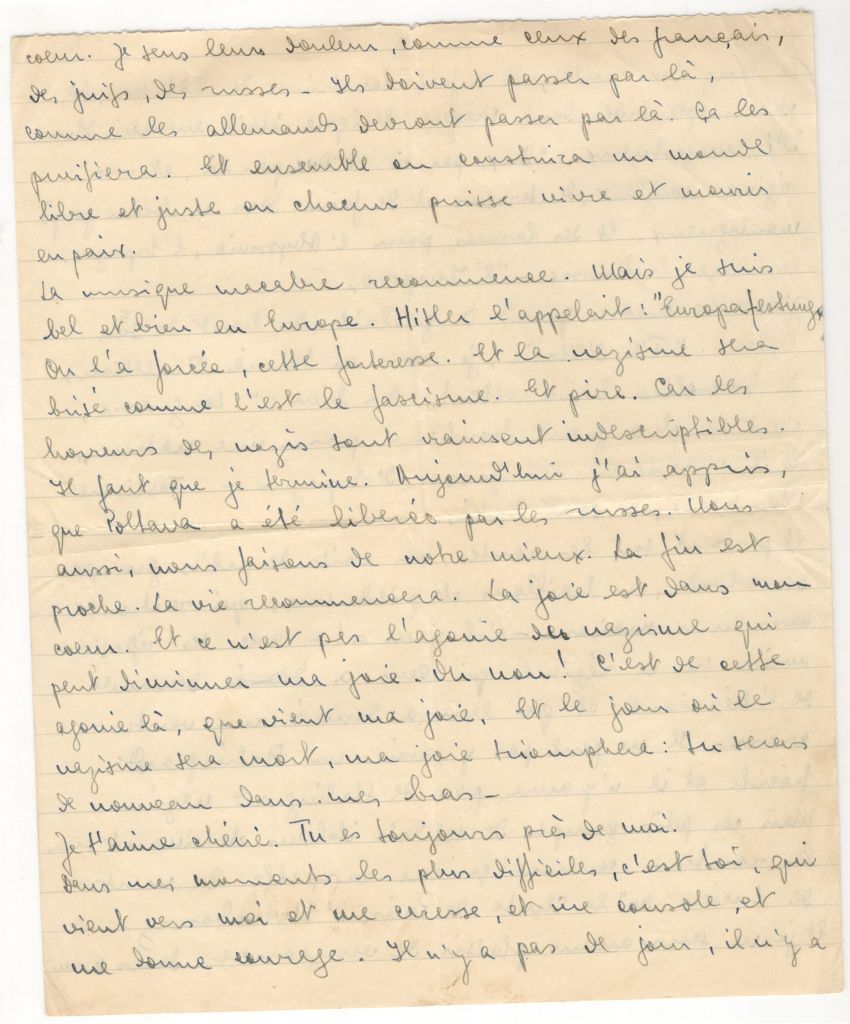 The macabre music begins again. But I am well and happy in Europe. Hitler called it: Europafestung”. Now we have captured that fortress. And nazism will be smashed as fascism is. And worse. For the horrors of the nazis are truly indescribable.. I must stop now. Today I learnt that Poltava has been liberated by the Russians. We will also do our best. The end approaches. Life begins again. Joy is in my heart. And it is not the agony of Nazism, which can diminish my joy. Oh no! It is just that agony which brings me joy. And the day when nazism dies, my joy will triumph: you will again be in my arms.