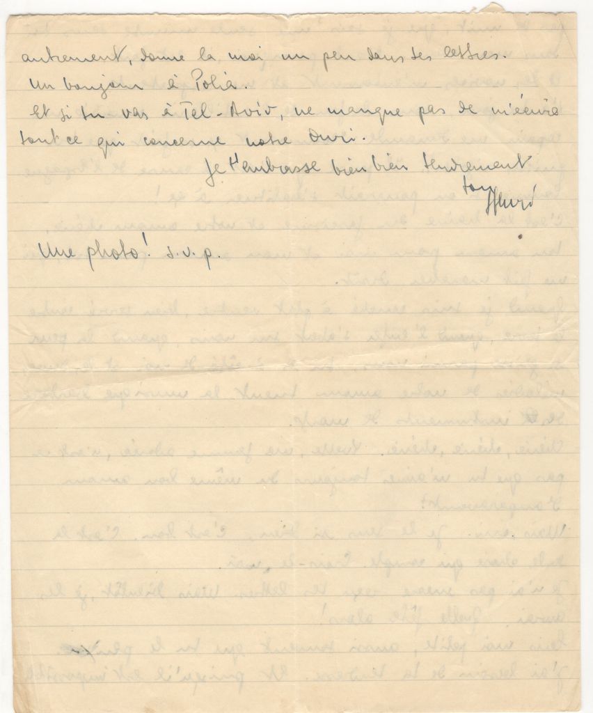 Write to me little one, as often as you can. I need your tenderness. And since it is impossible in any other way, give me a little in your letters. Say hello to Polia. And if you go to Tel-Aviv don’t forget to write me everything about our Ouri.