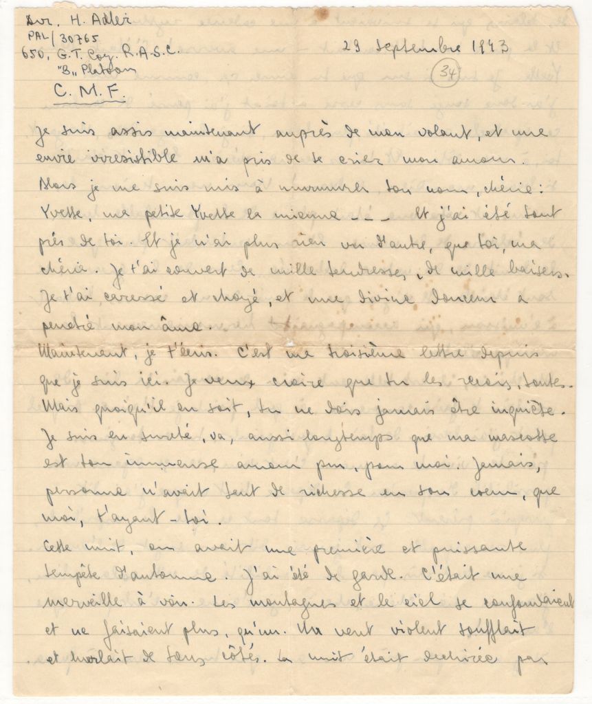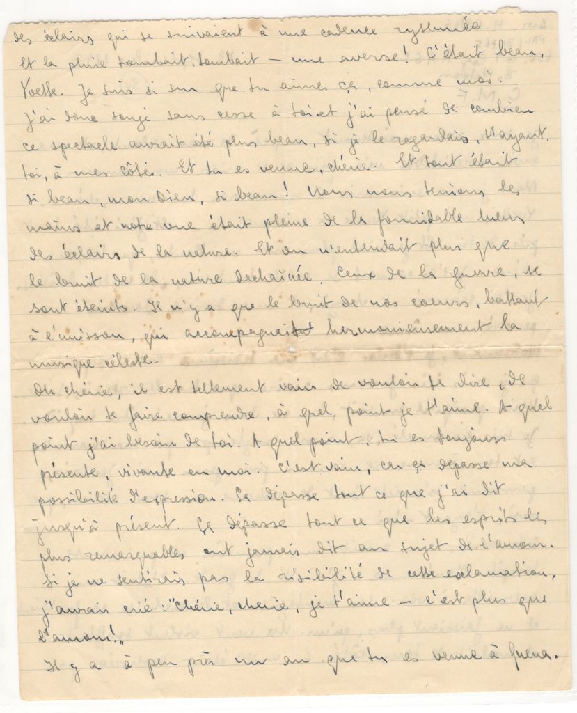 Tonight we had our first and powerful autumn storm. I was on guard. It was a marvel to see. The mountains and the sky merged, making only one. A violent wind hurled in on all sides. The night was torn by flashes of lightning, followed by rhythmical thunderclaps and the rain fell- a real downpour! It was beautiful, Yvette. I am so sure that you would love it, as I do. I then dreamed constantly of you and I thought of how many spectacles would have been more beautiful had I gazed at them with you by my side. And you came, darling. And everything was so beautiful, my God, so beautiful! We held each other’s hands and before our eyes was the formidable light of the lightning flashes. And we heard nothing but the sounds of nature unleashed. Those of the war were extinguished. There was only the noise of our hearts beating in unison, harmoniously accompanying the celestial music.