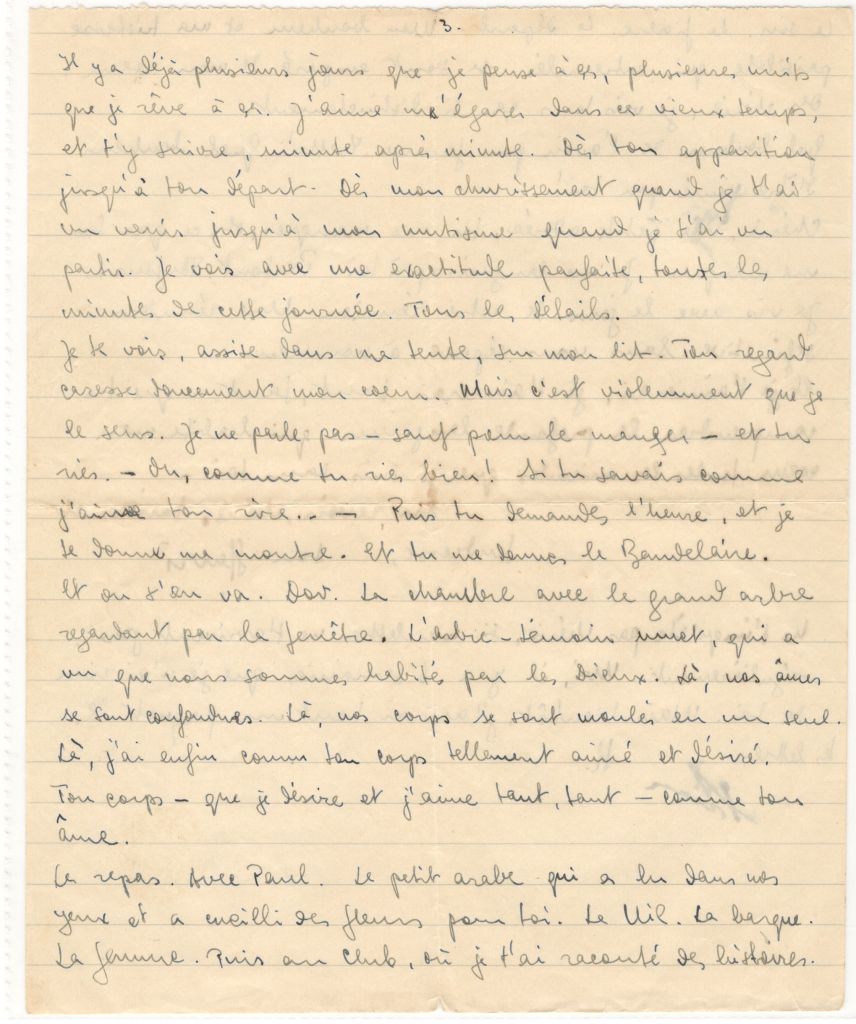I see you, sitting in my tent, on my bed. You gaze caresses my heart sweetly. But it is violently that I feel it. I don’t speak – except to eat it- and you laugh. Oh, how wonderfully you laugh! If you knew how I love your laugh. Then you ask the time and I give you my watch. And you give me the Baudelaire. And we left. Dov. The room with the great tree looking through the window. The tree – dumb witness, which saw that we were inhabited by the Gods. There, our souls intermingled. There our bodies were moulded into one. There, I at last knew your body so much loved and desired. Your body- that I desire and love to much, so much – like your soul.