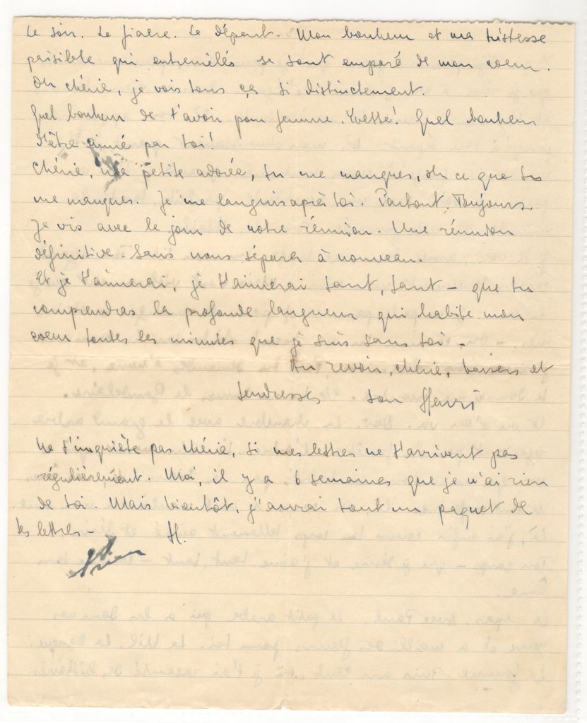 Don’t worry darling if my letters don’t arrive regularly. For my part, it is six weeks since I heard anything from you. But soon, I will have a whole packet of your letters. H