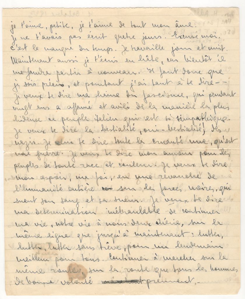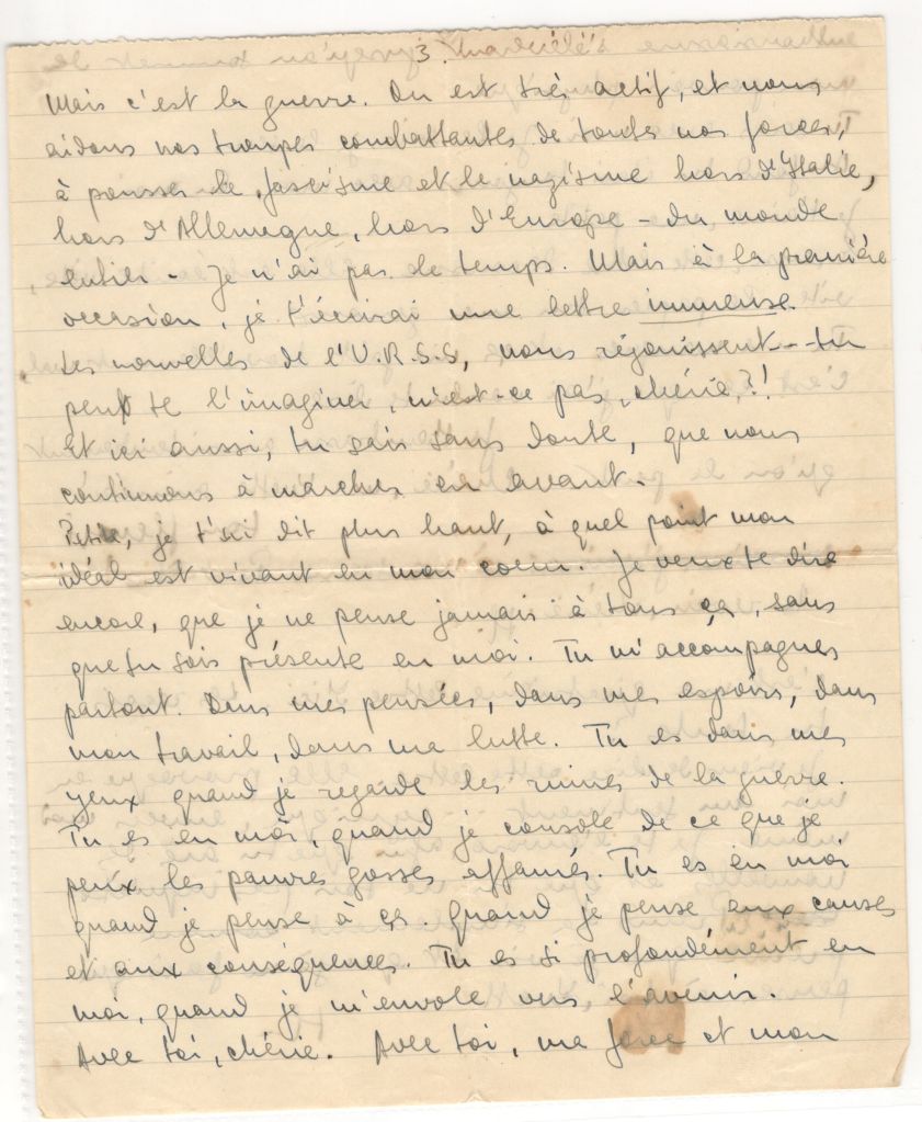 I want only to say: thank you, darling, oh my darling! And one more thing, one thing that, with our ideal is the very essence of my life, and it is:I love you, little one; I love you with all my soul. I have not written to you for four days. Excuse me, It is lack of time. I work day and night. Now, too, I am writing in haste because soon I will have to take off again. So I must be precise, and besides I have so much to say to you— I want to tell you of my hatred for fascism, which during twenty years has starved and degraded in a most hideous manner the Italian people who are so likeable. I want to tell you of the bestiality – yes bestiality- of the Nazis. I want to tell you of all the cruelty that is war. I want to tell you of my love for the people of all races and colours. I want to tell you of my hope, my faith in all humanity’s revenge on the dark forces, which shed its blood and kill it. I want to tell you of my unshakeable determination to continue my life, our life together, darling, in the same direction as it has gone up to now: to struggle, struggle, struggle without respite for a better tomorrow for everyone. To continue along the same road, on the road that all men of good will take.