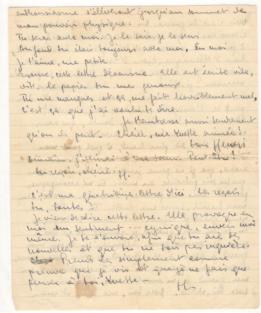 I have just re-read this letter. It provokes in me a feeling— cynical, against myself even. I send it to you so that you will have news and so you won’t be worried. Take it simply as proof that I am alive and that I think only of you, Yvette.H