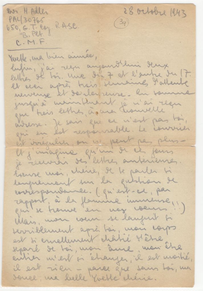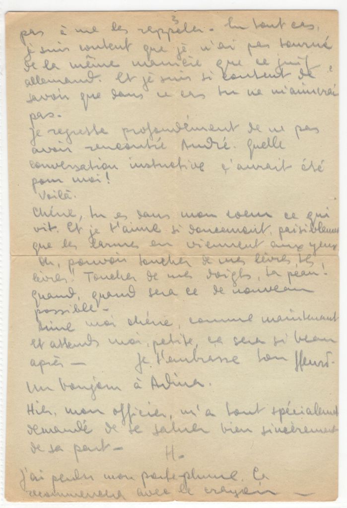 I wonder if you have received my letters. You don’t mention that. I am worried by your worry. I have sent you a pile of letters and I only know that you have received the first one. Several days ago, I sent you a little gift. I wonder whether you have received it. You mention in your letters that you have met several of my former comrades. It seems that they know me. But I can’t manage to recall them. In any case, I am pleased that I have not turned in the same way as that German Jew. And I am so pleased to know that if I had you would not love me.