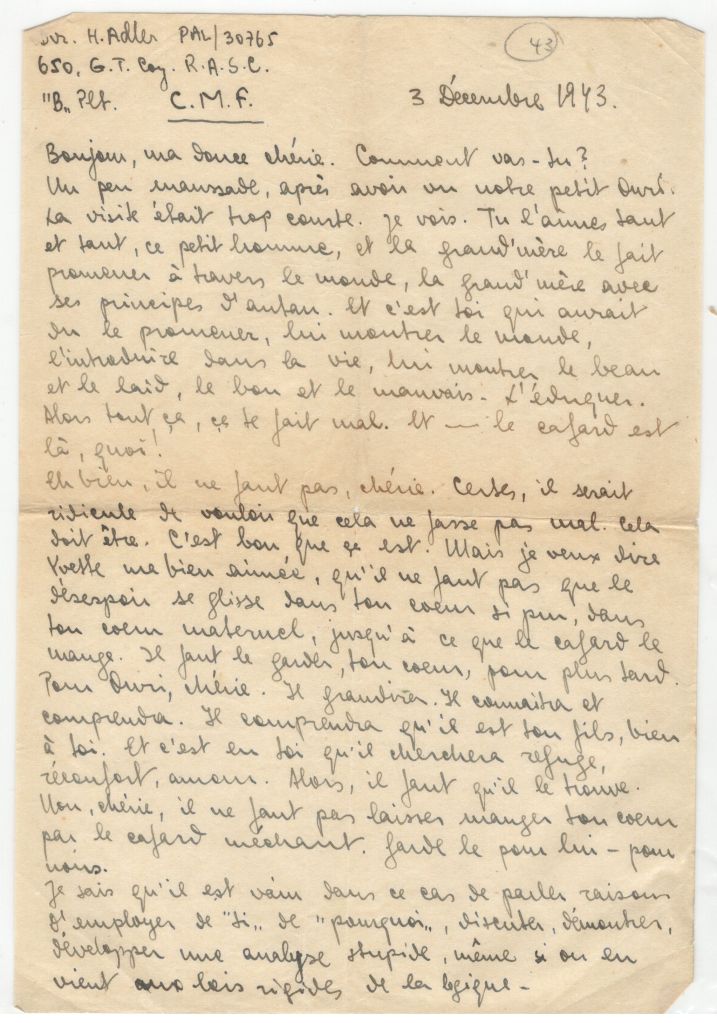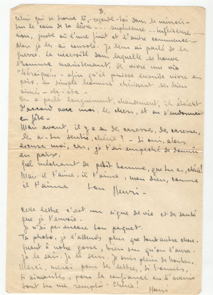 Good morning. My sweet darling. How are you? A little disgruntled after having seen our little Ouri. The visit was too short. I see it. You love him so very much, this little man, and the grand mother makes him walk through the world, the grand mother with her out of date principles. And it is you who should have walked with him; you show him to the world, to introduce him into life, to show him the beautiful and the ugly, the good and the bad. To educate him. So all that makes you feel bad – the blues are there, eh!