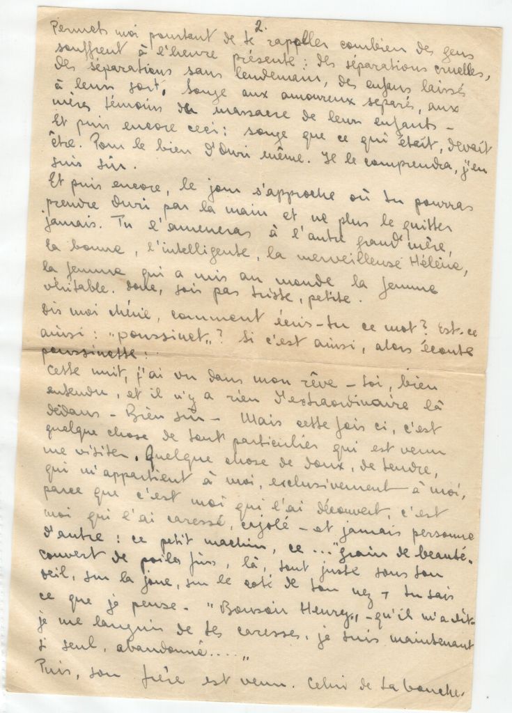 Well it mustn’t be so, darling. Of course it would be ridiculous to wish that it wouldn’t upset you. It has to. It’s good that it does. But I want to say to Yvette, my well beloved, that you mustn’t let despair enter your heart so pure, into your motherly heart, to the point where depression eats it. You must protect your heart for later. For Ouri, darling. He will grow. He will know and he will understand. He will understand that he is your son, really yours. And it is in you that he will seek refuge, comfort, and love. Then he will need to find it. No darling, you must let your heart be eaten by wicked depression. Protect it for him – for us.