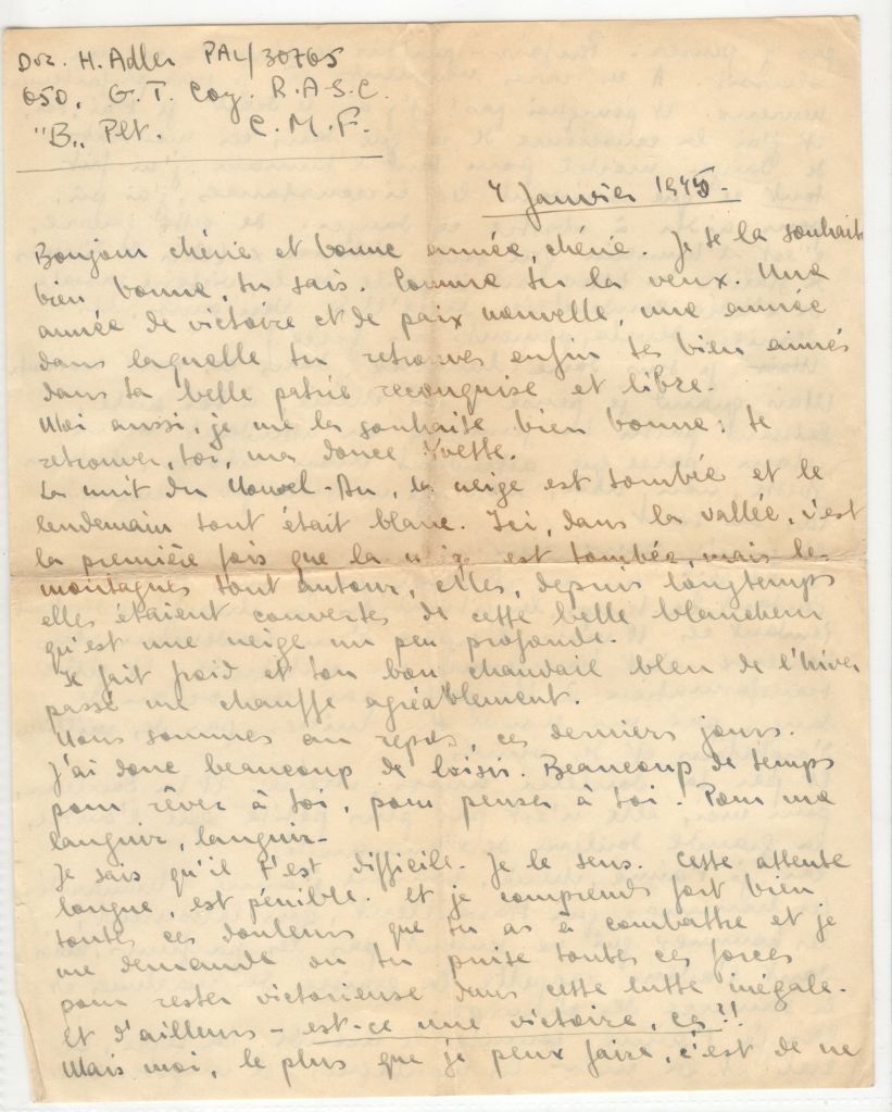 Happy New-Year darling. I wish you everything good and beautiful, everything as you wish. A year of victory and of peace, a year when you rejoin your beloved family in your beautiful native land reconquered and free at last …. We are resting for the last days so I have lots of leisure. Lots of time to dream about you, to think of you. To pine for you… In rare moments, I am perfectly happy. And why not? I have the right to be. I have you and I am conscious that in the moments of mortal danger to all humanity I did all that I could, given the circumstances, to help defeat that danger. It is humanity that is the victor of this war. (See Stalin’s speech on 7 Nov where he speaks of the moral victory of the idea of the USSR. See also the latest developments in Greece) So I am happy in rare moments.