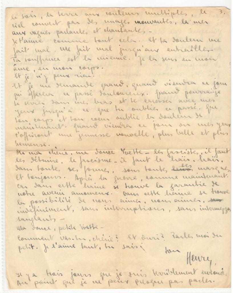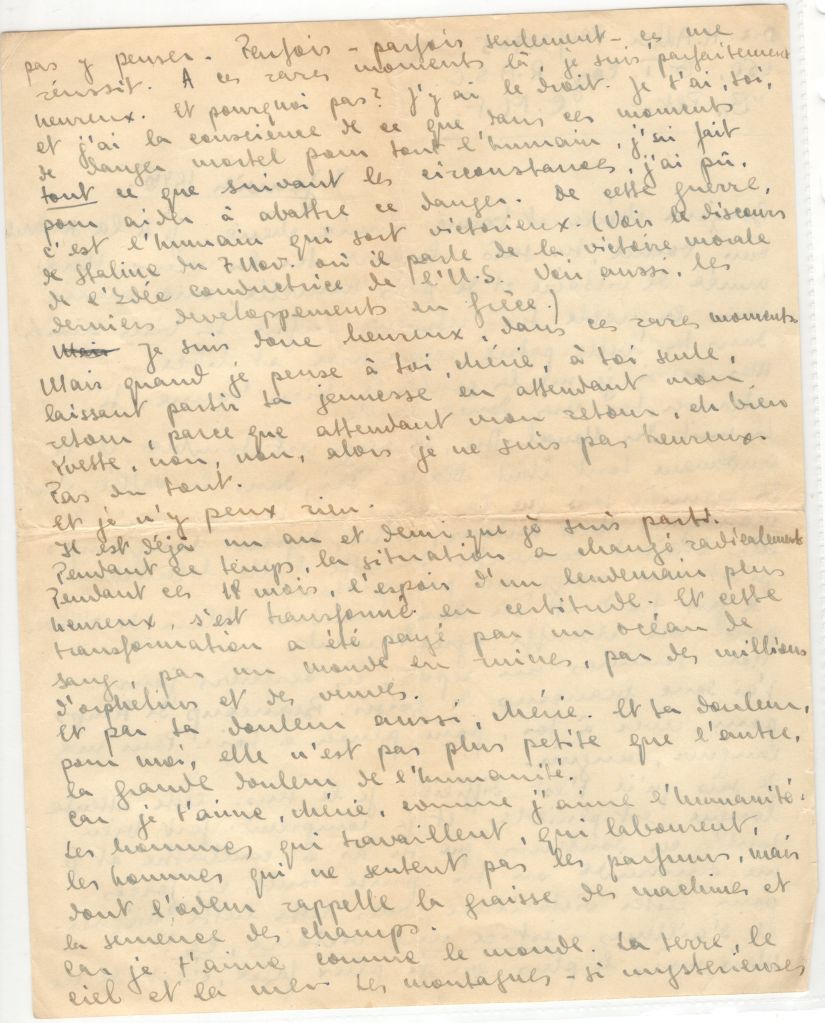 It’s already a year and a half since I left. During that time the situation has profoundly changed. During those 18 months the hope for a happier tomorrow has been transformed into a certainty. And this transformation has been paid for by an ocean of blood, by a ruined world, by millions of orphans and widows. And by your suffering too darling. And your suffering for me is not less than the other, the great suffering of humanity. Because I love you darling, just as I love humanity. The men who work, who labour, the men who don’t smell of perfume but whose smell recalls the grease of machines and the seed of the fields. Because I love you like the world, the earth, the sky and the sea, the mountains so mysterious…….
