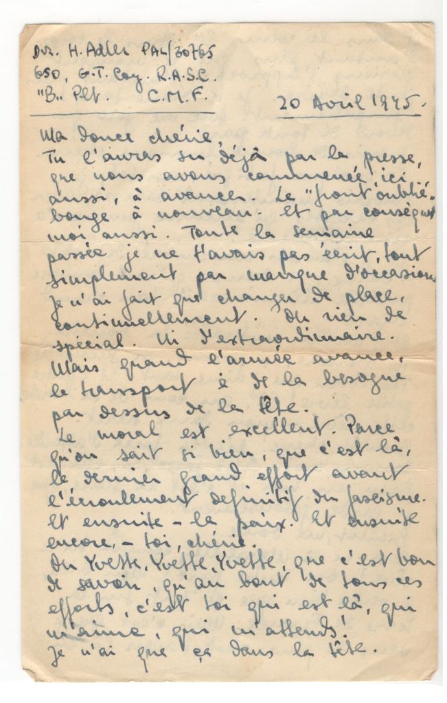 You will have already known from the press that here we have also begun to advance. The “forgotten front” moves again and as a result, me too. I haven’t been able to write to you for the last week because I was constantly on the move and I simply couldn’t. Nothing special, but when the army advances, transport has the job of going at the head. Morale is excellent because we know so well that this is the last thrust before the final collapse of fascism. And then – peace. And then again – you, darling. ….