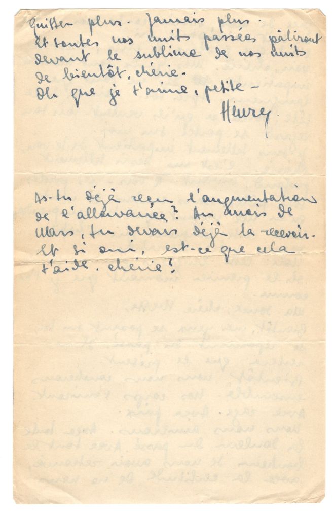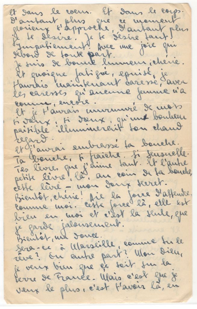 Will Marseilles be as you dream it? Or somewhere else. My God, how I want you to be o n French soil. But what I want most is to have you there in front of me, pressed against me and it doesn’t matter where that will be… We will love each other. With all the sadness of the past. with all the happiness of having found each other again, with the certainty of never parting again. Ever. And all those past nights fade before the sublime nights to come, darling.