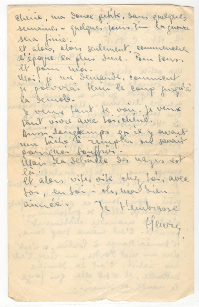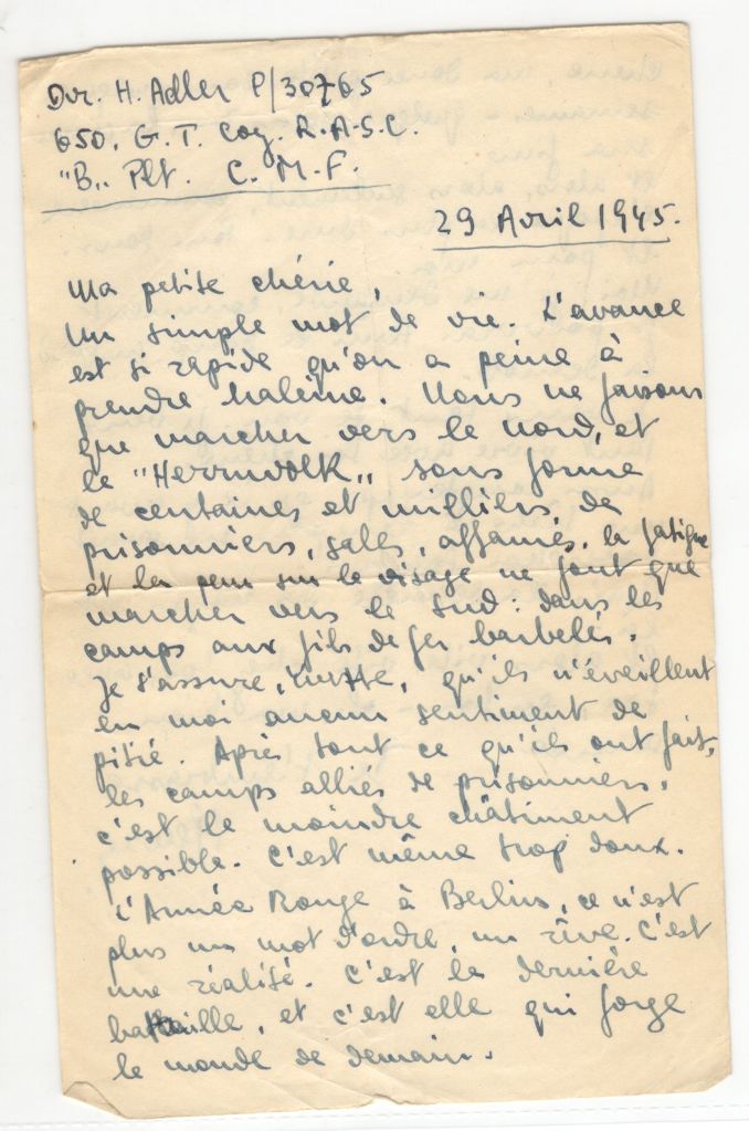 The advance is so rapid that one can scarcely draw breath. We do nothing but march north and the “herrenvolk” in the shape of hundreds and thousand of prisoners of war, dirty, famished, fatigue and fear on their faces do nothing but march south; into barbed wire camps. I assure you, Yvette, that that they arouse in me not any feeling of pity. After everything they have done, allied prisoner of war camps are the least punishment possible. It is even too soft. The Red Army in Berlin is no long an order of the day, a dream. It is a reality. It is the last battle, the one that will forge the world of tomorrow. Darling, my sweet little one, in some weeks – some days? – the war will be over. And then, only then will begin the hardest time for everyone. And for me. I ask myself how will I be able to hold on until demob. I want so much to see you. So much to live with you, darling. As long as there was a task to fulfil, I knew how to suffer. But the Nazi debacle is here……