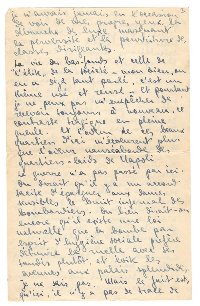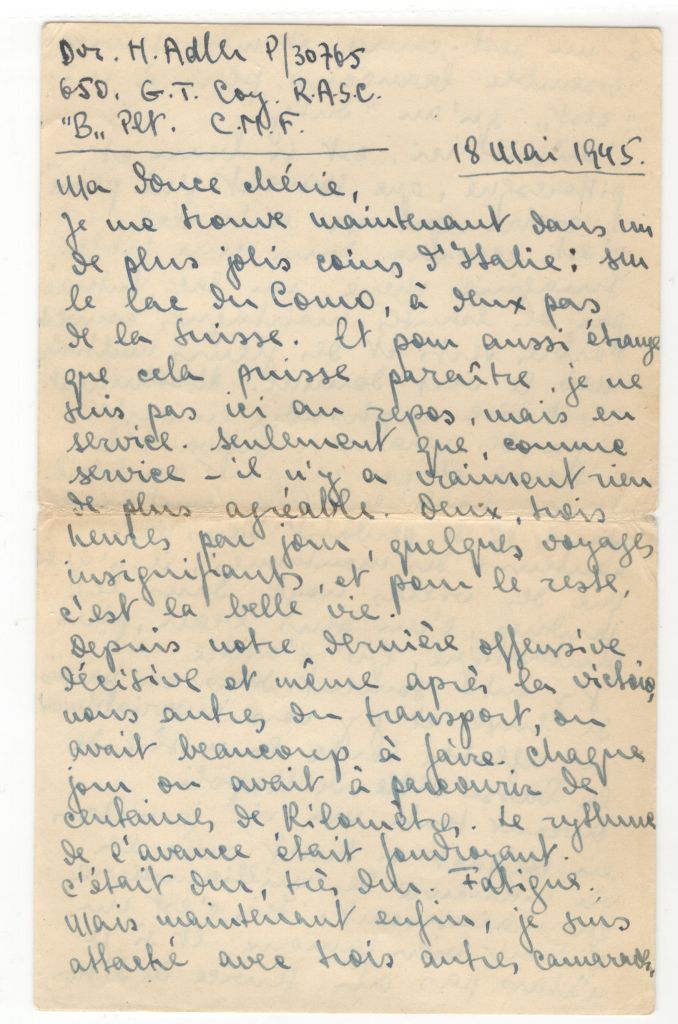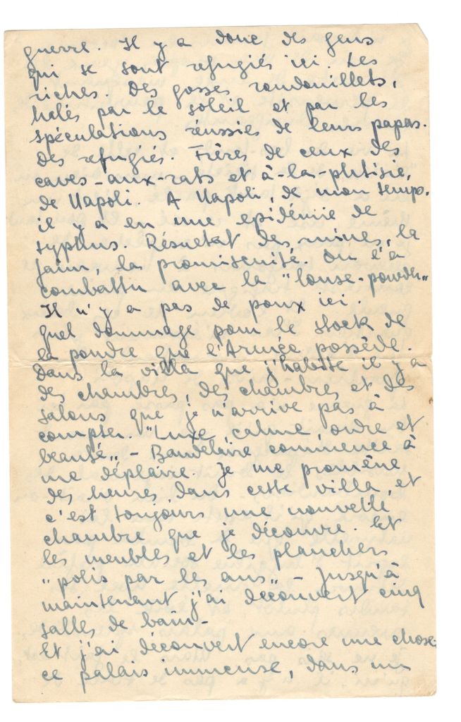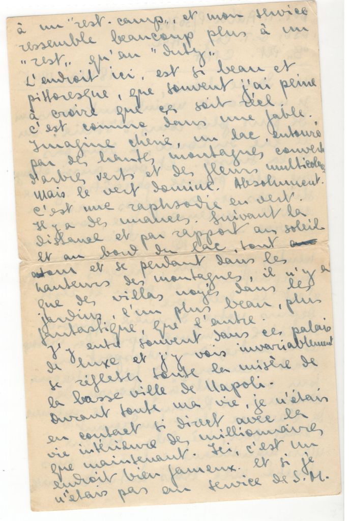 Since our last decisive offensive and even after victory we of transport have a lot to do. Each day I drove hundreds of kilometres. We advanced at lightning speed. It was very, very hard. Tiring. But now at last I’m attached with three comrades to a “rest-camp”(Eng) and my service is much more like “rest” (Eng) than “duty”(Eng). The surroundings here are so beautiful and picturesque that I often have trouble in believing that they are real. It’s like a fairytale. Imagine, darling, a lake surrounded by high mountains covered with green trees and multicoloured flowers. But the green dominates absolutely. It’s a rhapsody in green… In the height of the mountains there are only villas bathed in gardens, each more beautiful, more fantastic than the other. I often go into these luxurious palaces and in them always see reflected all the misery of the low town of Naples. In all my life I was never in such close contact with the interior life of millionaires as I am now. This is a very famous place. And if I were not in the service of HM I would never have had occasion to see with my own eyes the riot of luxury hiding the perversity and the rottenness of the ruling classes….