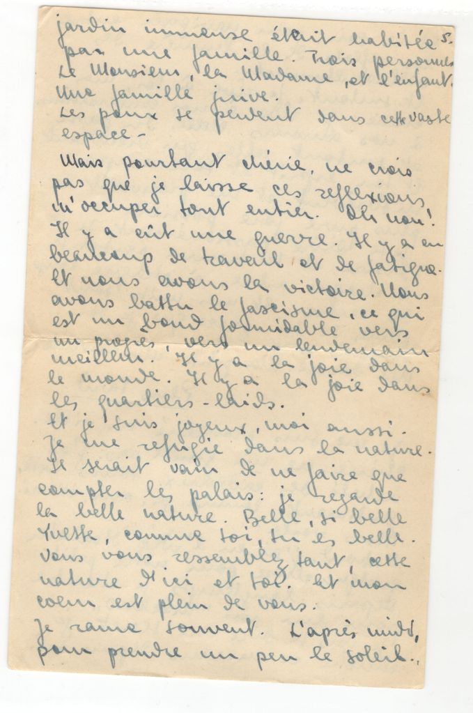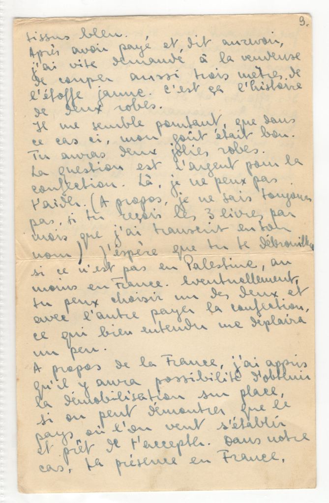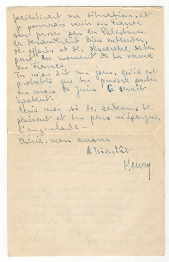 I have learnt that it will be possible to get demobilised where you are, if you can show that the country where you want to stay is ready to accept you. In our case, your presence in France would make my situation easier and I could come to France without going through Palestine. That would mean some trouble and some steps on your part as soon as you arrive in France. You said to me once that it’s probable you will leave in June. That would be wonderful.