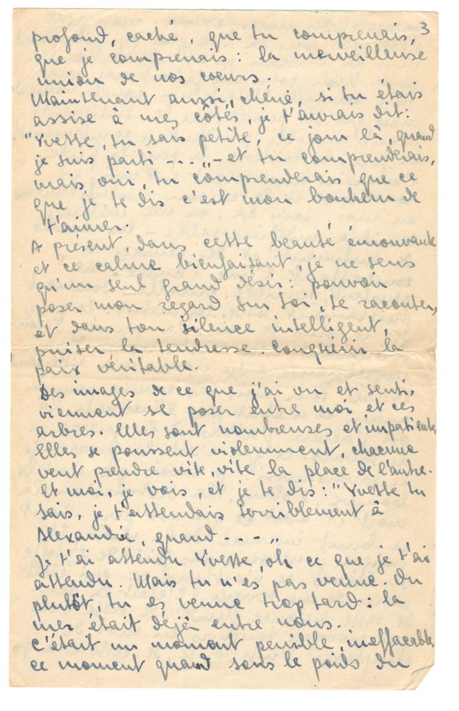 Everyone has gone to the ball. To dance. So I am here alone. For my dancing – My god- you know I whistle the tune, I tap the rhythm with my feet, but I forget the movements. The bear, it’s the dance of the bear. Ours, exclusively ours. So I am here alone. But actually not lone, because you are with me. ***He keeps reminding her of Maadi, of the times they’ve been together**** One terrible, cruel thought dominates the others: the fear of no longer seeing you. The thought of having before us this vast mysterious stretch of water between us has literally wiped me out. For unlike the others, I did not go into the unknown. I had been to war, I knew it. I also knew what war was. I knew that it was the bomb, the cannon, destruction, death and what is worse, all the terrible noise of death. And although I’m not made of the stuff of heroes, it was not that that caused me terror. It was fear of that fluid distance, of that sea which always raises in me inferiority complexes, of that deep hidden water, that you understood and that I understood: the marvellous union of our hearts…. I remember Alexandria… I waited for you there, but you didn’t come. Rather, you came, but too late; the sea was already between us. It was a painful moment