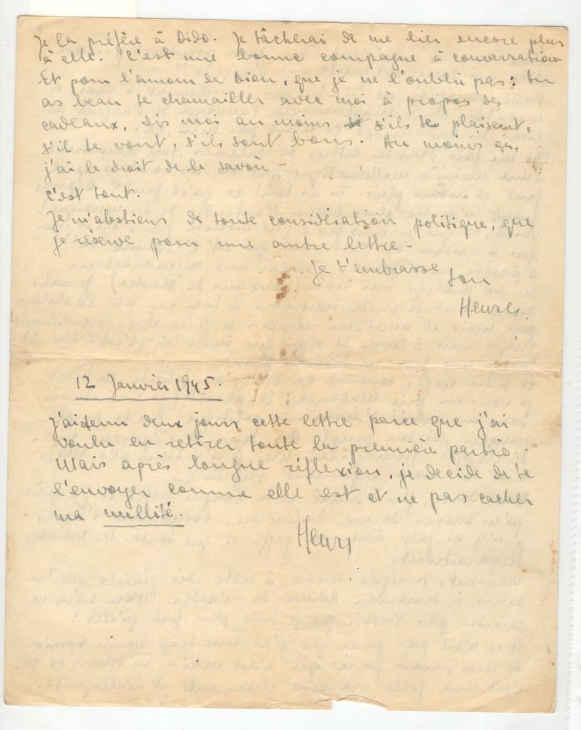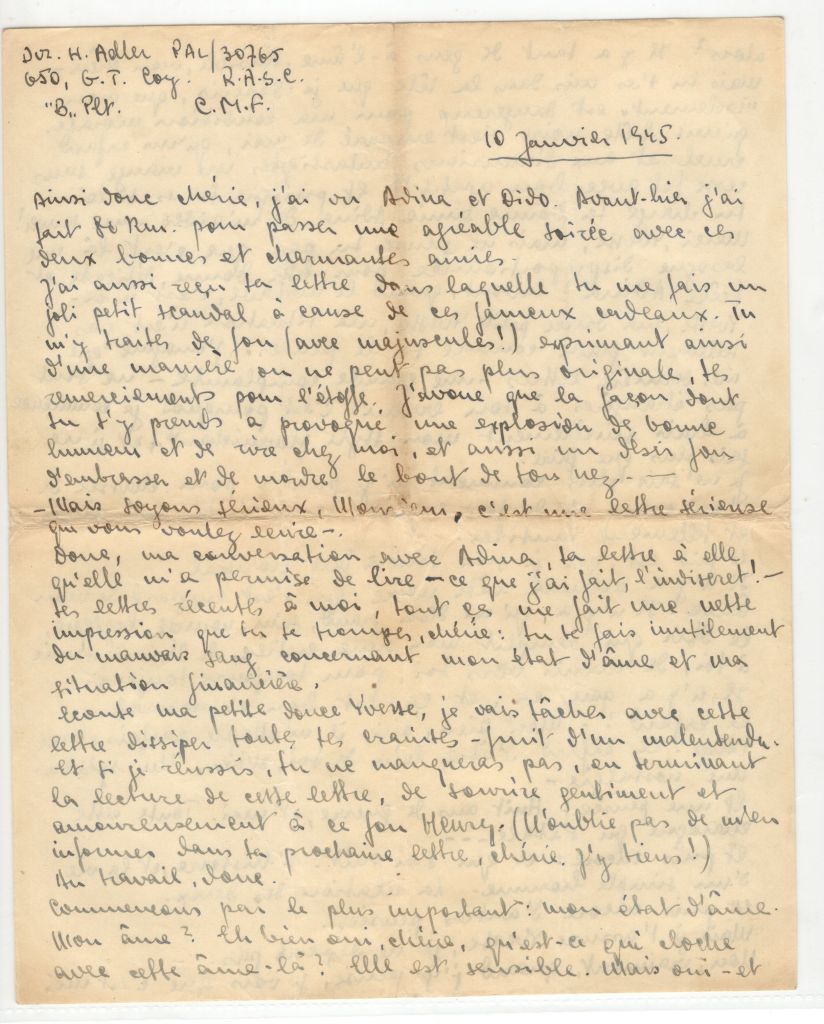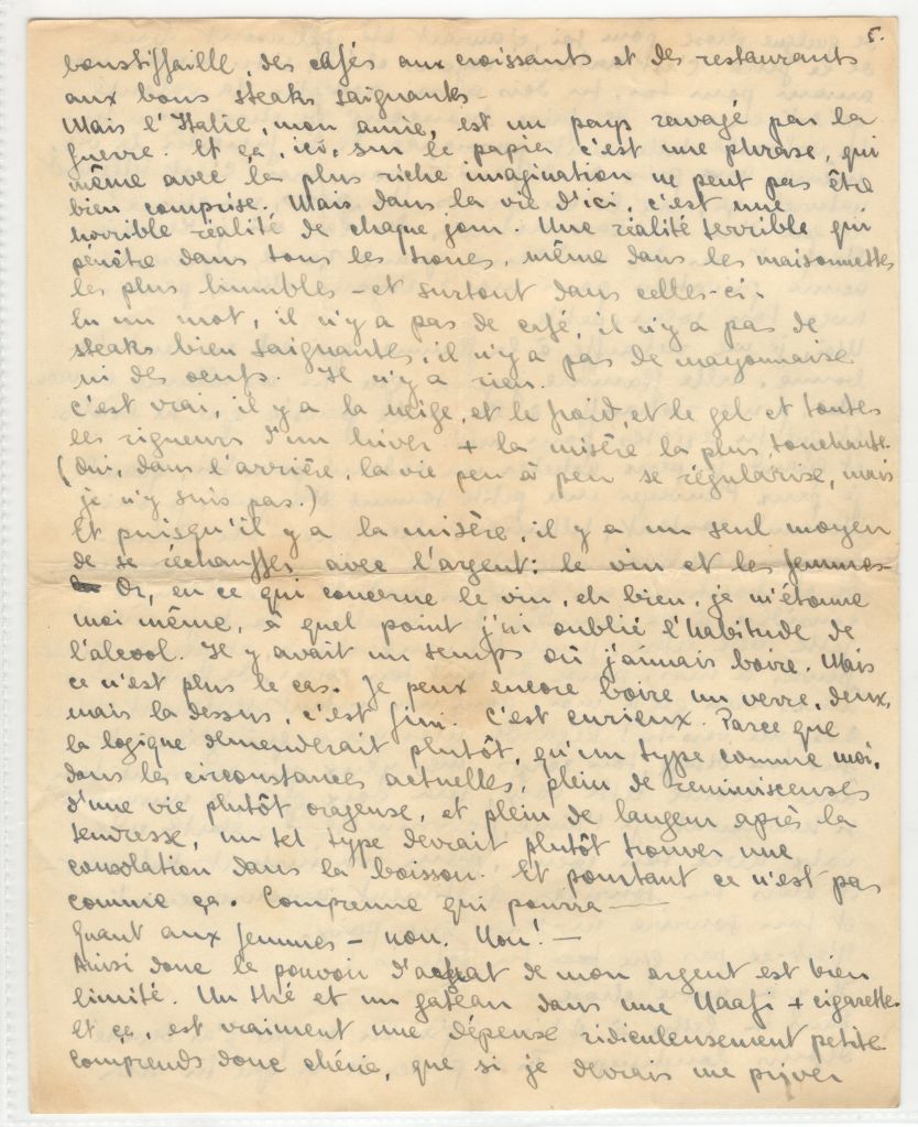 You don’t picture accurately the present situation of Italy. And outside your work in the military hospital, all you understand of the war is Cairo filled with troops, luxurious and cheap grub, croissant cafes and good red steak restaurants. But Italy, my friend is a country ravaged by war. And that here on paper is a phrase that even with the richest imagination cannot be well understood. But here it is a terrible daily reality that penetrates every hole of life, even in the humblest little house p above all in those. In a word, there is no café, there are no good red steaks, there is no mayonnaise, nor eggs. There is nothing. It is true; there is snow, ice and all the rigours of winter plus the most touching misery. (Yes, in the rear, life becomes more regular little by little, but I am not there.) And since there is misery, there is only one way of warming oneself with money: wine and women. Now as to wine, I am astonished to find that I have lost the habit of alcohol. There was a time when I liked to drink. But it’s no longer the case. I can still drink a glass or two, but no more. It’s curious. Because logical would demand that a fellow like me in my present circumstances, full of memories of a rather storm life and full of a longing for tenderness, would rather find consolation in drink. However it’s not like that. Understand it if you can. As for women – no. NO! So the buying power of my money is very limited. A tea and cake in a NAAFI and cigarettes. That is truly a ridiculously small expense. (She has written to her friend Adina, saying Henry is too poor to buy cigarettes and coffee; living in terrible conditions etc etc; he shouldn’t buy gifts for her.)…..