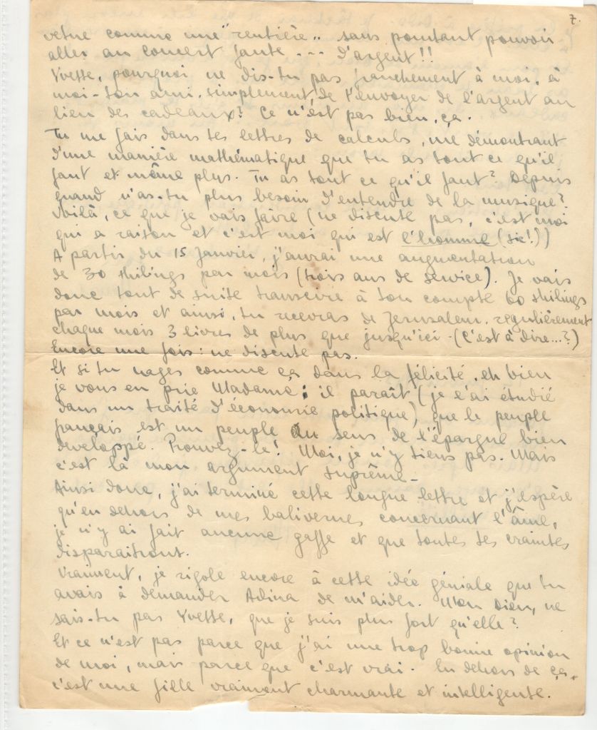 From 15 January I will have a raise of 30 shillings a month (3 years service). I will immediately put in your account 60 shilling a month and so you will receive in Jerusalem regularly each month 3 pounds more than now… So you had better not squabble with me about those presents; tell me at least if you like them, if you want them and if they are good. At least that I have the right to know. That’s all. I abstain from all political conversation and reserve it for another letter.