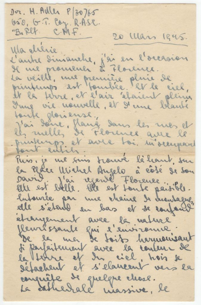 The other Sunday I had the opportunity of strolling about Florence. The night before, the first spring rain fell and earth and sky and air were filled with new life and a new and quite glorious beauty…I found myself high up on the Place Michel Angelo by the side of his David. I looked down on Florence…. I imagined how good it would be to stand beside David with you…Next week I have a meeting with Adina and Dido in Florence. They will come there from the South and I from the North. I know how that will be. They will talk to me about politics and I will think about something else. And I will have to respond to them and will come out with stupidities. I will think of you and that marvellous thing which is our love and how good it is that the war, despite all its cruelty has not managed to kill the beauty of the world and of man.