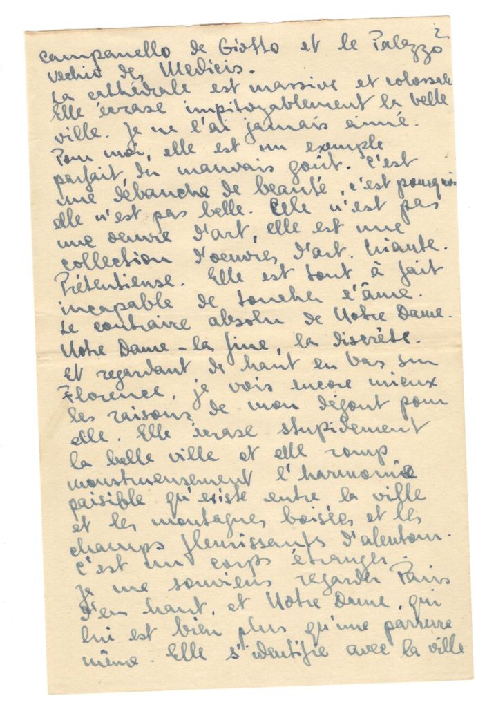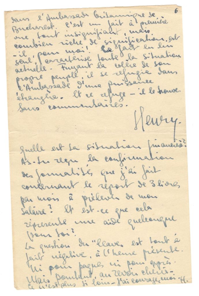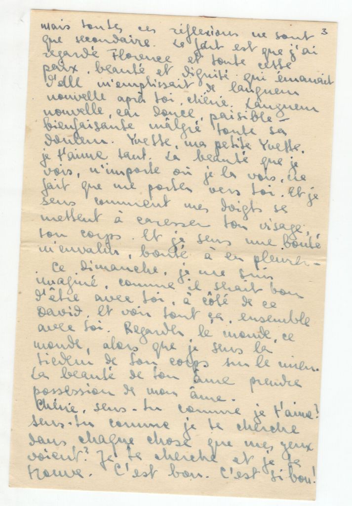 I have received the letter where you tell me of your certainty of being in France this summer. I wish it with all my heart, Yvette. I hope that your mother’s steps are fruitful. You cannot know, my darling, how much my heart is filled with joy at your presence in France in the heart of your family. It is so important for your future. And it will break definitively your relations with Palestine. That’s important. I truly regret not having the strength to write to Helene.
