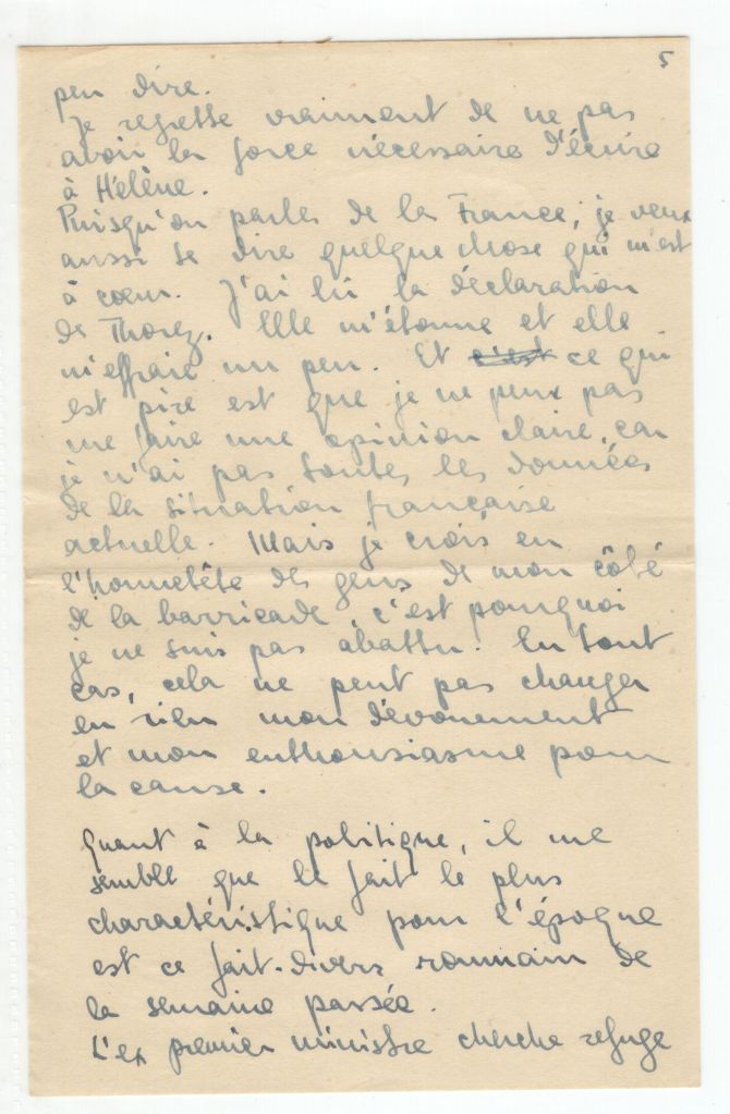 Since we’re talking about France, I want to tell you something else that’s in y heart. I read Thorez’ declaration. It astonished and frightened me a little. And what is worse is that I can’t form a clear opinion since I don’t have all the information about the present situation in France. But I believe in the honesty of men on my side of the barricade that’s why I’m not dejected. In any case, that can’t change in any way my devotion and my enthusiasm for the cause.