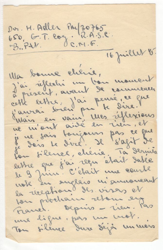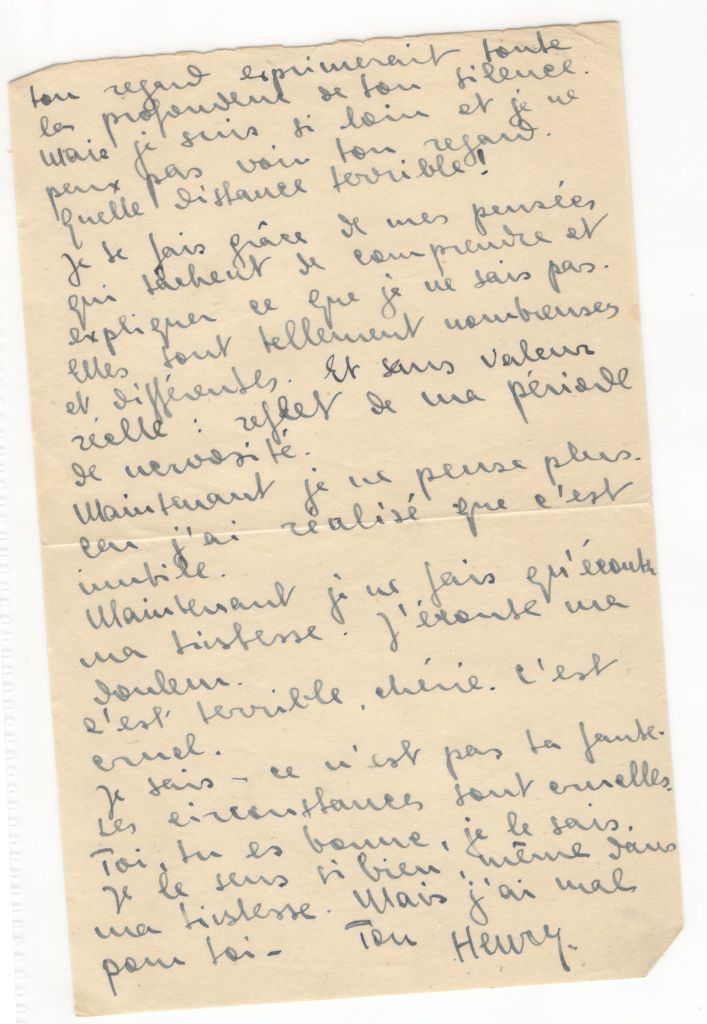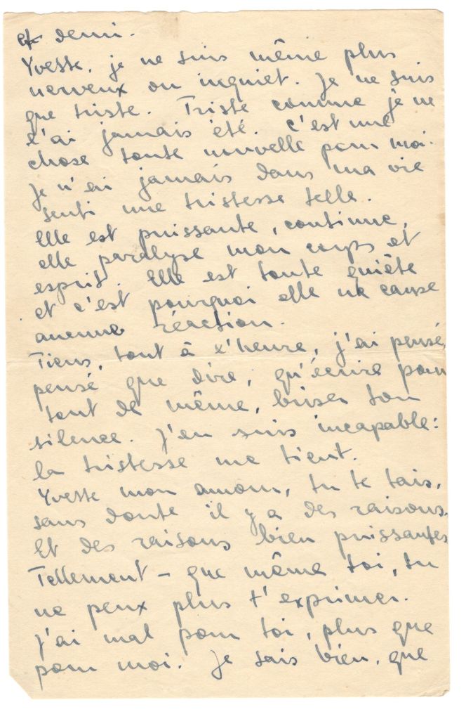 I reflected for a good while before beginning this letter, wondering what I could say to you. But my reflections didn’t help and I still don’t know what to say. It’s about your silence, darling. The last letter I received from you was dated the 9 June. A short letter in English… since then nothing. Not a line, not a word. Your silence has lasted a month and a half. Yvette, I am no longer just nervous or anxious. I am only sad. Sadder than I have ever been. It’s something quite new for me. I have never in all my life felt such sadness… Yvette my love, you are silent, without doubt there are reasons. And very powerful reasons. So powerful that even you cannot express them. I feel badly for you, more than for myself. I know well that your look would express the profoundness of your silence. But I am so far away and I cannot see your look. What a terrible distance.