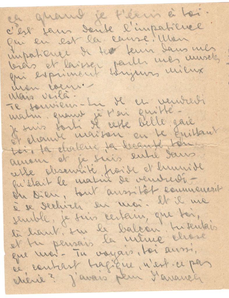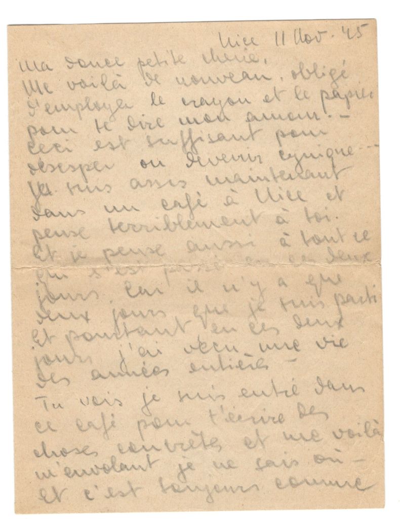 … I am sitting in a cafe at Nice and think terribly about you. Think also of everything that has happened these last two days. For it is only two days since I left. However in these two days I lived a whole life of years. You see I came into this cafe to write concrete things to you and here I am wandering all over the place. And it is always like that when I write to you. No doubt it’s caused by impatience. My impatience to hold you in my arms and let my muscles speak for they always express my heart better. But there it is.