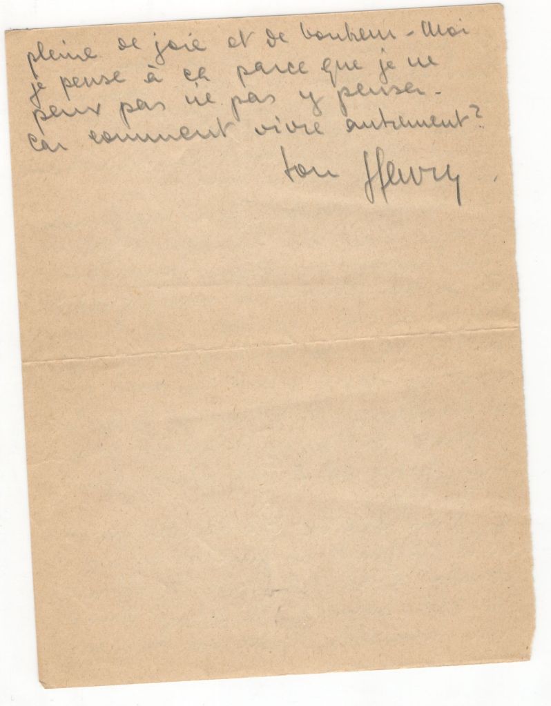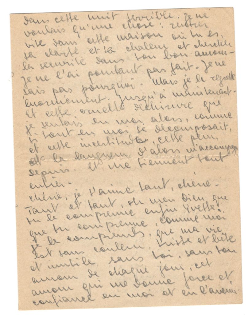 I can no longer live without you. I want to return as soon as possible. Because next year I want to have a child. And I want to begin my life, that’s to say with you, to live with you. And you, since I am not there to influence you, can examine yourself in all tranquillity and decide whether you love me as I love you. If yes, help me to return legally. If that is impossible and if you really want it I will desert. Or perhaps you will find that it’s better to wait for demobilisation. But then too you will have to help me not to return to Palestine. Our marriage will have to be legalised. Perhaps that will help me to come again to France to fix up the formalities. Think about all that darling. Take your time and write to me. I love you Yvette. You are my wife darling. It is such an enormous happiness to have you for a wife. You are mine, my wife and when I think of that, when I write that all my anxieties vanish and only happiness; calm and certainty remain in me… If one decides to wait until summer, one must never stop thinking of that. Never. And wait for the summer as the beginning of a new, happy life filled with joy, bonheur, I think of that because I cant not. How could I live otherwise?
