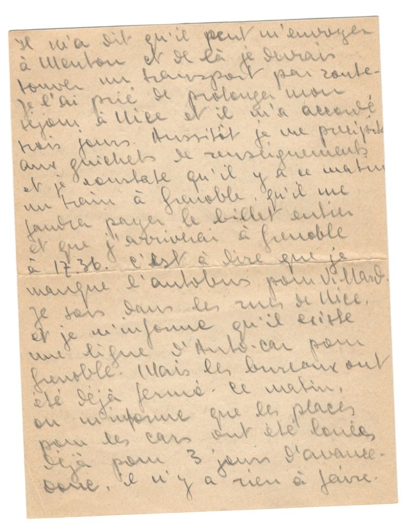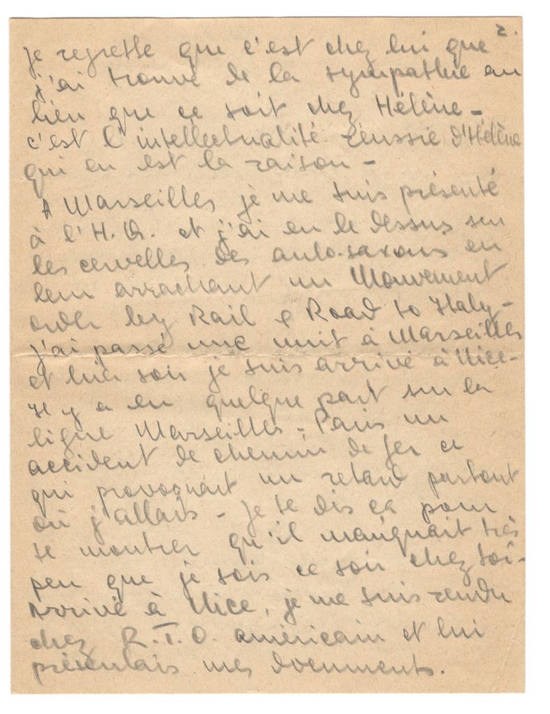 I regret that it was at his house that I found sympathy instead of Helene’s – her intellectuality ??? is the reason. At Marseilles I presented myself at HQ and j’ai en le dessus sur les cervelles des anglo-saxons en leur arrachant un Movement Order by rail and road to Italy. I spent a night in Marseilles and yesterday evening I arrived in Nice. Somewhere on the Marseilles-Paris line there was a railway accident which made every connection late. I tell you that to show you that it would take very little for me to be at your place this evening. Arrived at Nice, I presented my documents to the officer in charge at the American R.T.O . He told me he could send me to Menton and from there I could pick up road transport. I asked him to prolong my stay in Nice and he gave me three days. Straight away I rushed to the information counter and found that there’s a train to Grenoble this morning. (But then couldn’t connect with the bus for Villare transport details for getting back to Belmont. No seats on bus.) So there’s nothing to be done. I tell you all that to show you how much I don’t want to leave you. The idea of returning in your direction again has not left me and since Friday morning I have thought of nothing but that. Because I want to have a child and because I want to have it with you and because I want to live with you, because to leave you is to die…. Now because I have no means of getting back I am forced to calm myself. To think calmly. That’s not easy, but this is what I think. I wont come to Grenoble any more this time (besides I have no longer the means, transport and money) At two o’clock I will go to Menton. Tomorrow without doubt I will be in Italy.