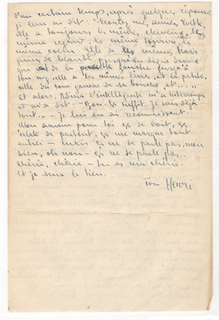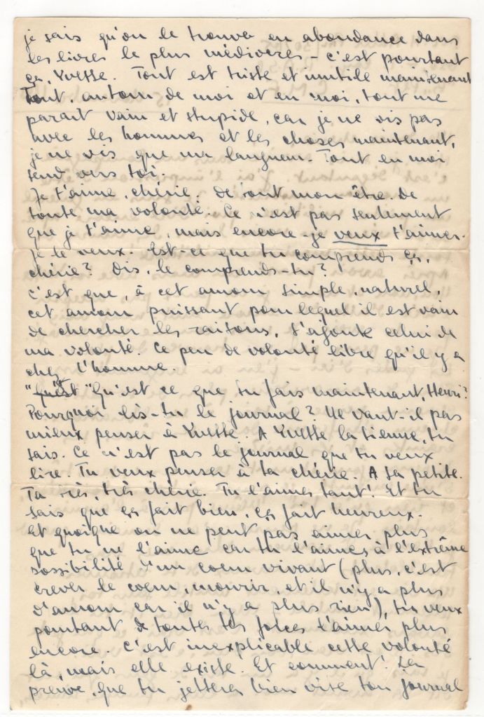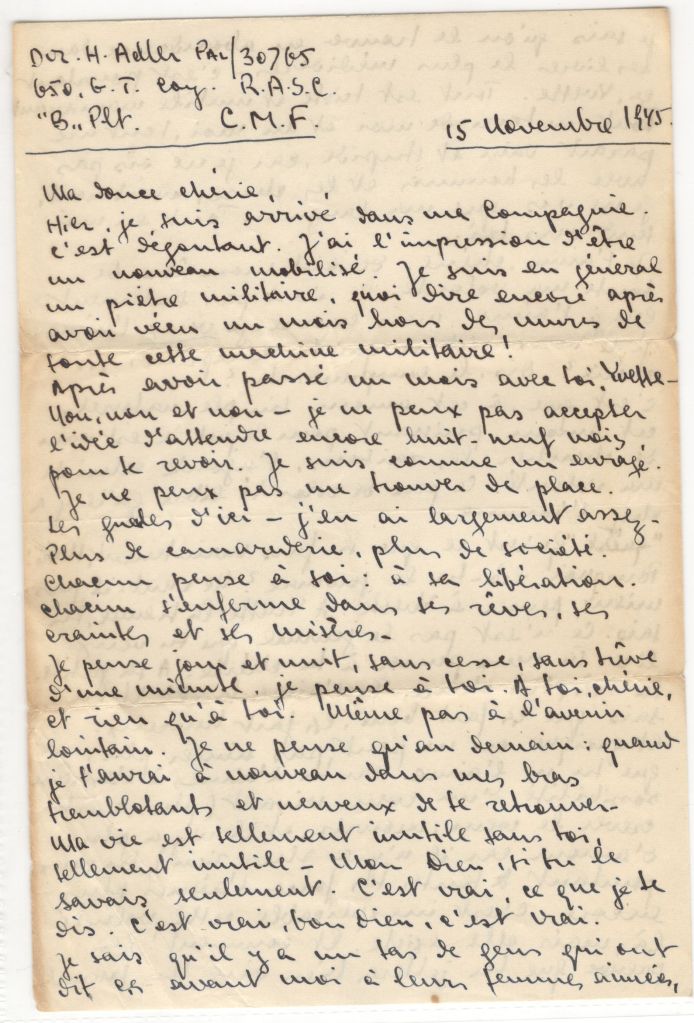 Yesterday I arrived back with my Company. It’s disgusting. I feel like a new recruit. In general I am a military pietre, as for now after having been a month outside the walls of this military machine! After having spent a month with you, Yvette. No, no, and NO! I cannot put up with the idea of waiting still another 8 or 9 months before seeing you again. I am like an enraged one. I can’t find my place. I’ve had more than enough of this place. No more camaraderie, no more society. Each man thinks of himself, of his discharge, each is enclosed in his own dreams, fears and unhappiness. Day and night I think of you….[He’s laying on the love so thickly in order to persuade her that she loves him and wants him. Even more than the early letters, his desperation is showing. Deep down he knows? That he’s not going to win this time – AI]